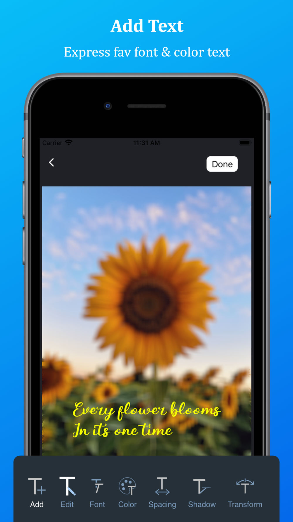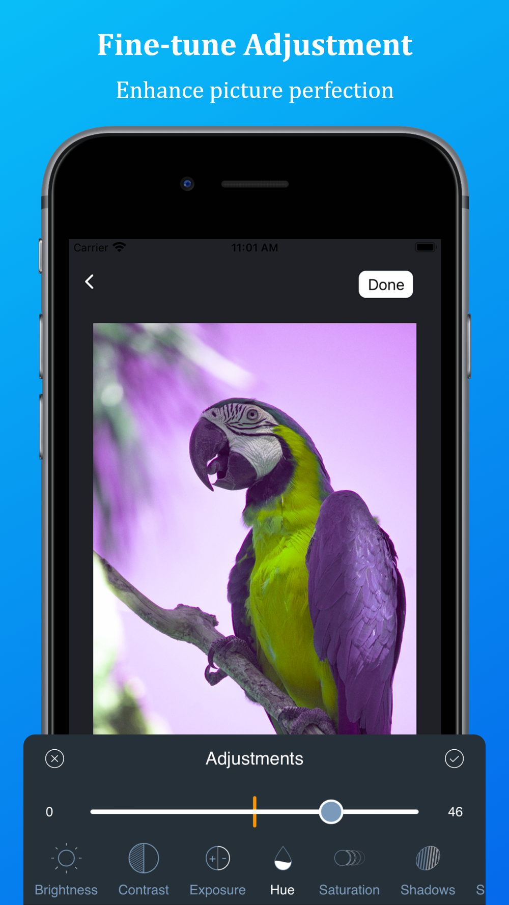 Enhance your photo by using the quick adjusting tools. This feature offers the option to retouch the individual detail of your photos, such as contrast, brightness, exposure, sharpness, hue, saturation, shadow, and tint to a perfect level.