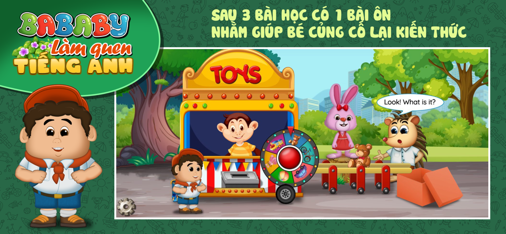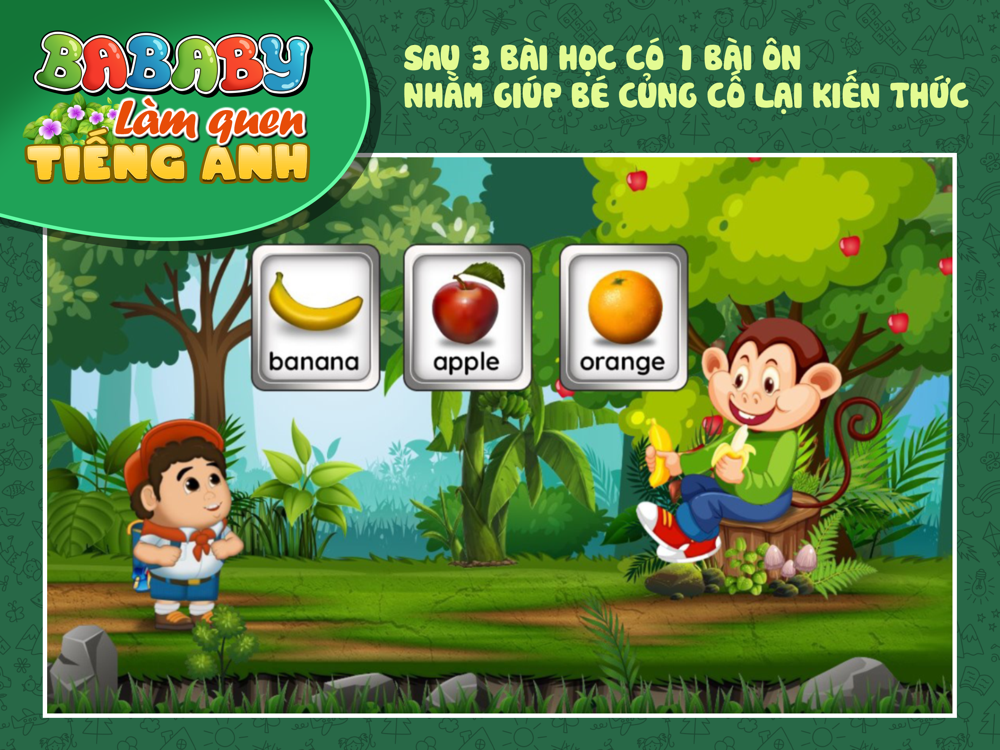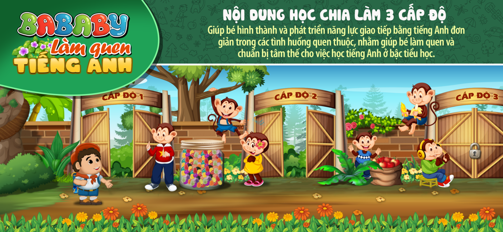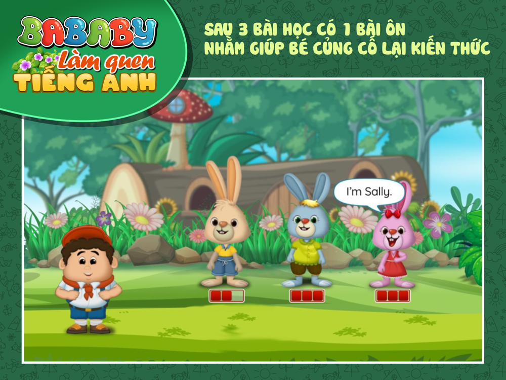 Ứng dụng BABABY — LÀM QUEN TIẾNG ANH dành cho lứa tuổi từ mẫu giáo đến lứa tuổi tiểu học chưa biết tiếng Anh, giúp bé hình thành và phát triển năng lực giao tiếp bằng tiếng Anh đơn giản trong các tình huống quen thuộc, nhằm giúp bé làm quen và chuẩn bị tâm thế cho việc học tiếng Anh ở bậc tiểu học.