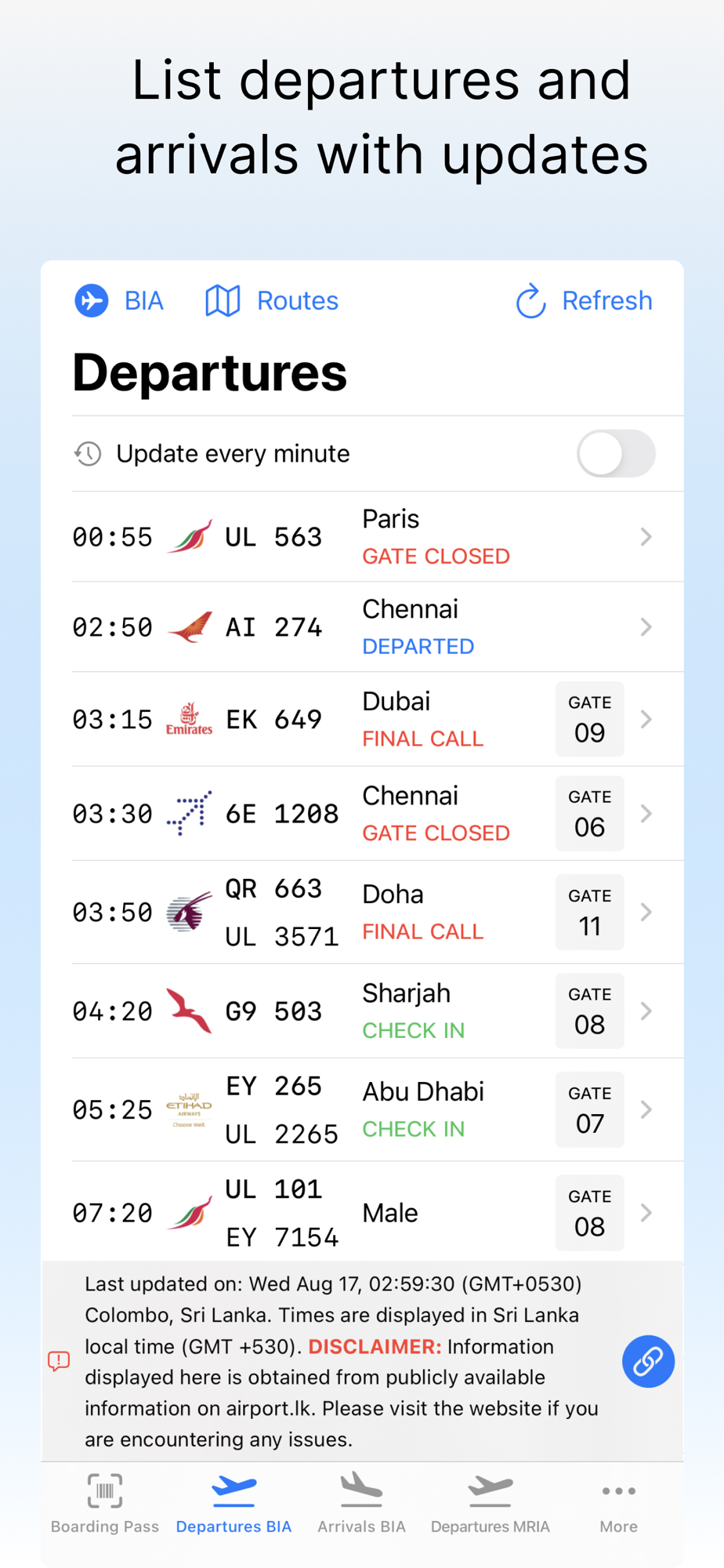 Get the up-to date flight arrival and departure times from the Sri Lankan Airports.
