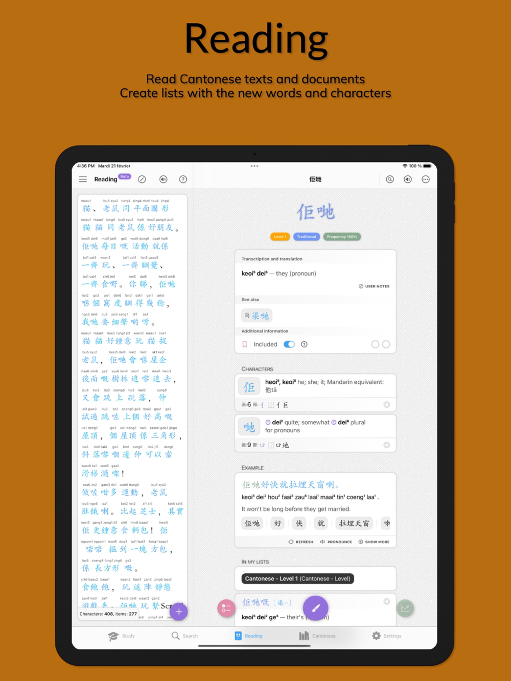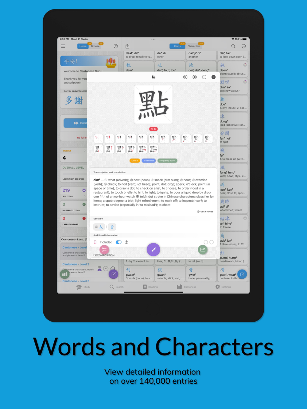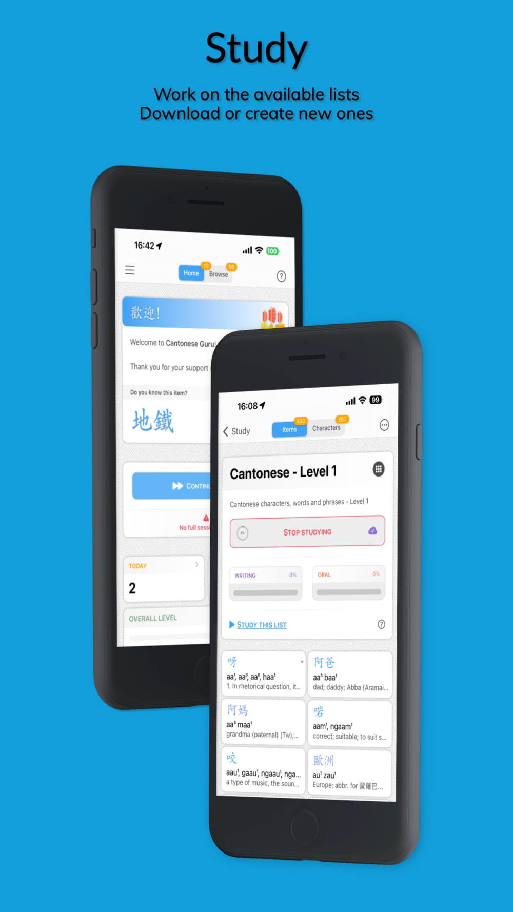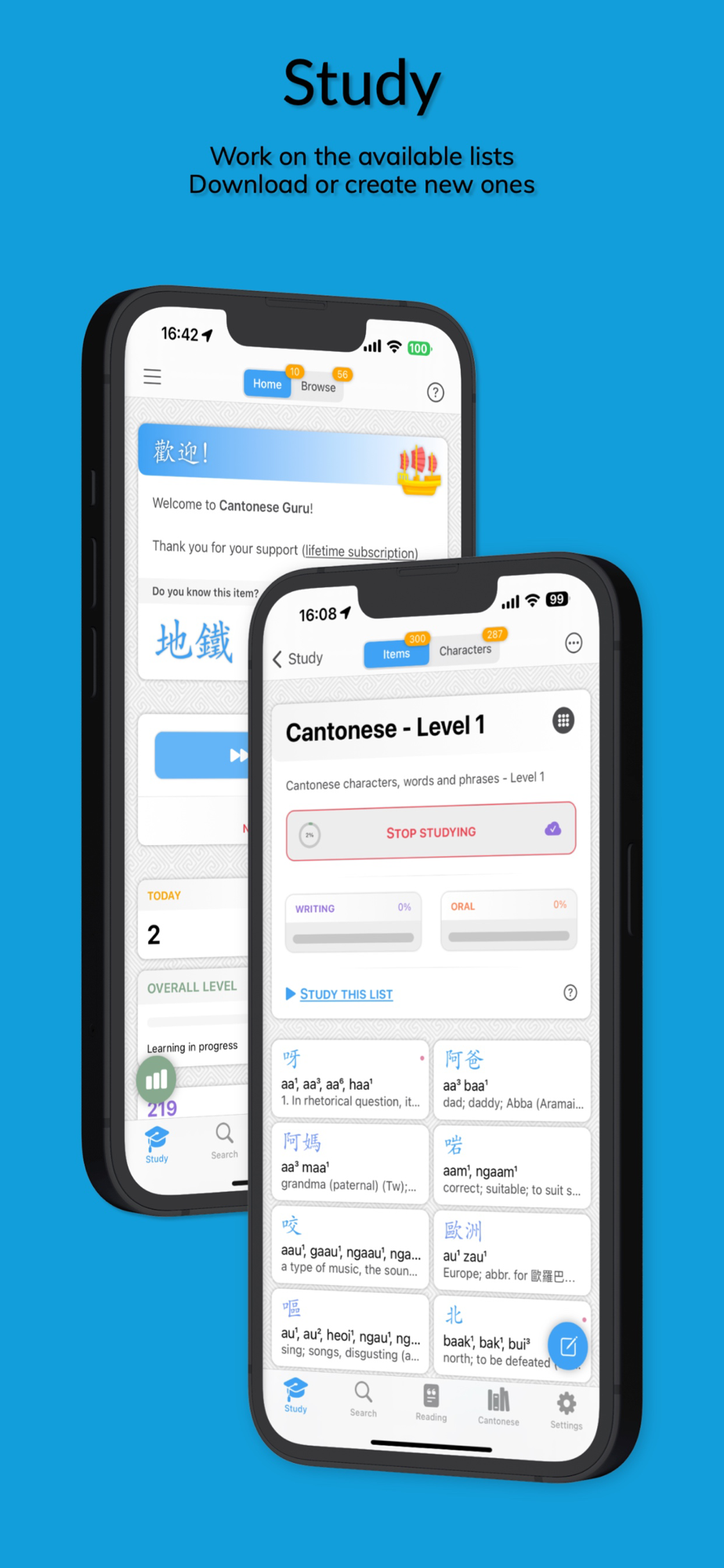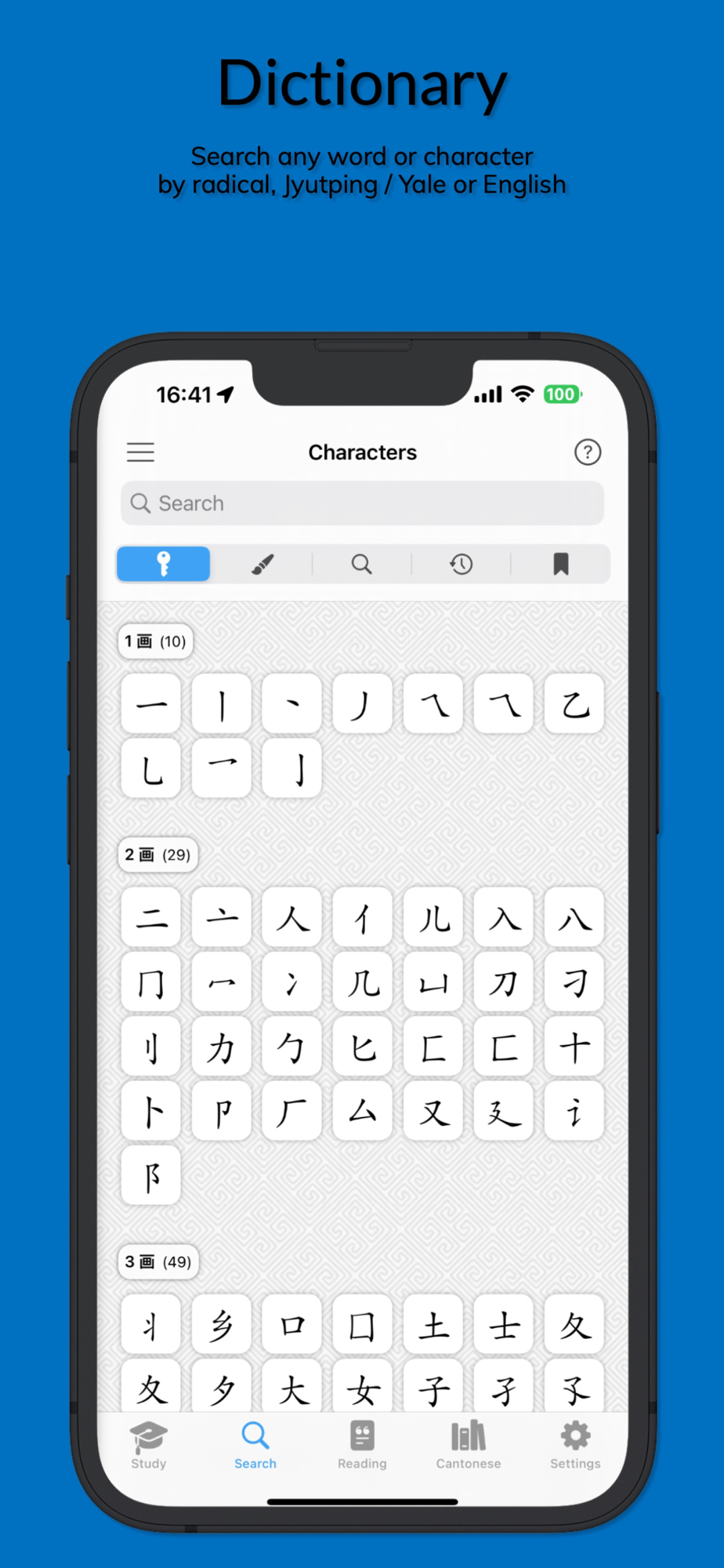 • Study the lists already available or create your own lists of Chinese characters and words. Just enter you words in Cantonese and the app will translate them. You can even download commonly used Chinese textbooks words lists.