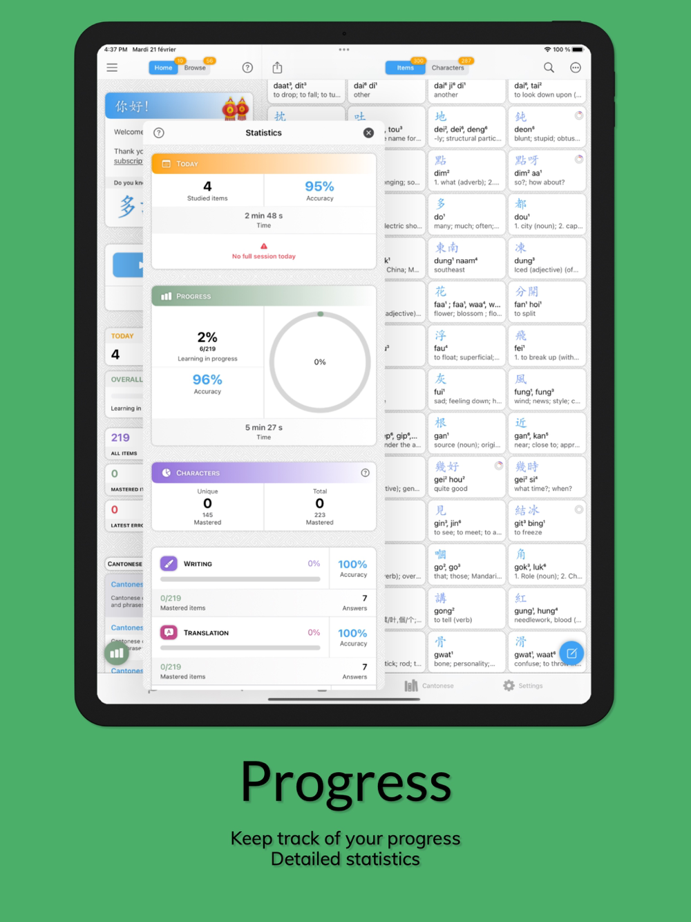 • Remember easily the meanings and translations of your Chinese characters and words.
