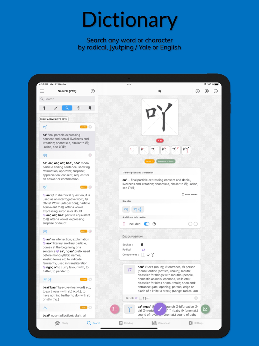 • Search any word or Chinese character, from Cantonese, jyutping/yale, or English.