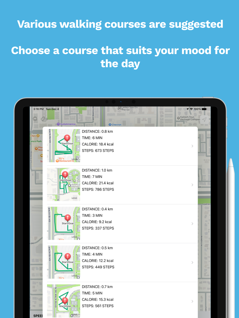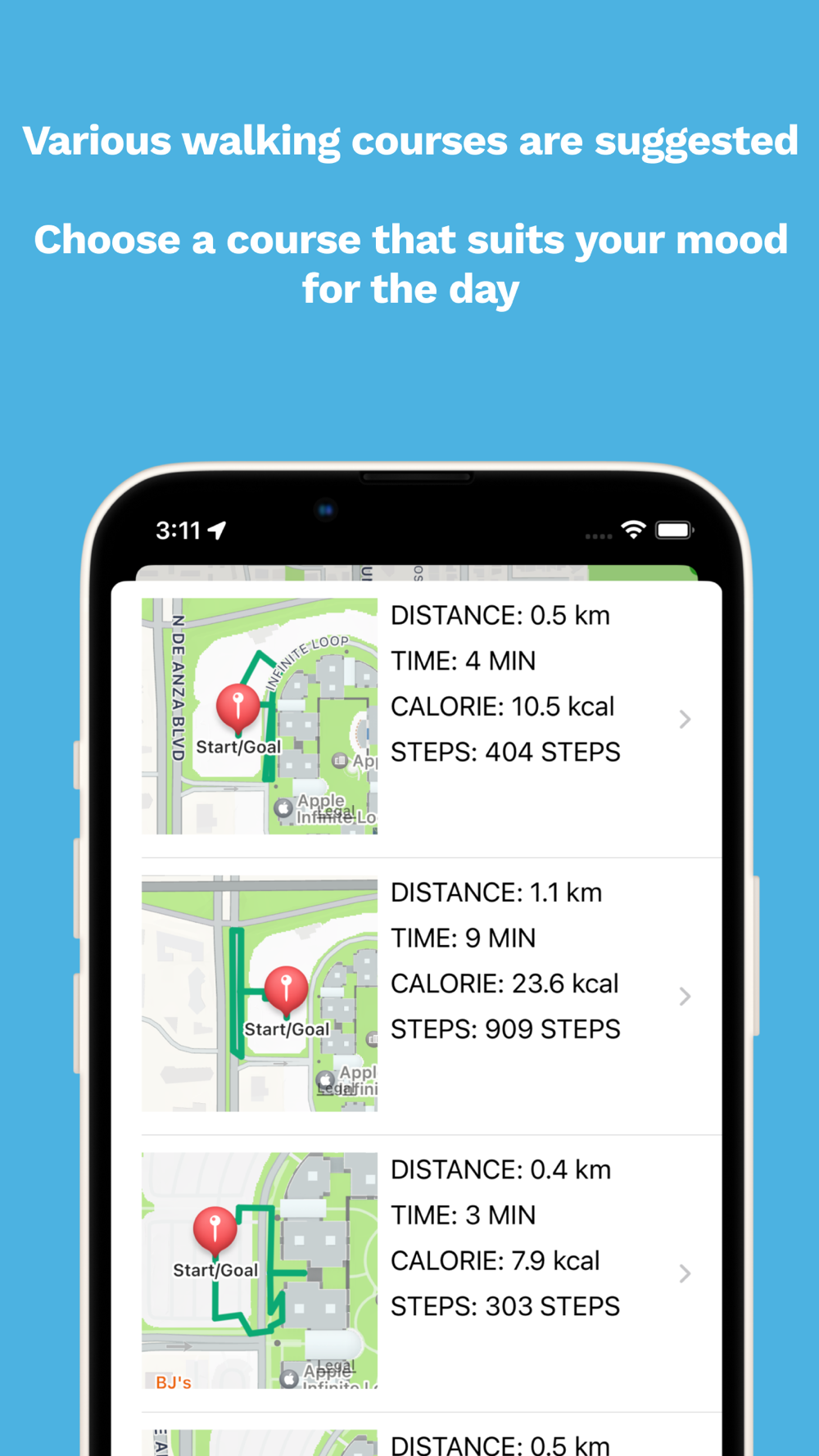 Take a healthy lifestyle by walking 7000 steps a day. If you're tired of the same old routine, try this app and explore five unique walking routes that match your desired walking time and speed. These routes may lead to new discoveries through unfamiliar paths.
