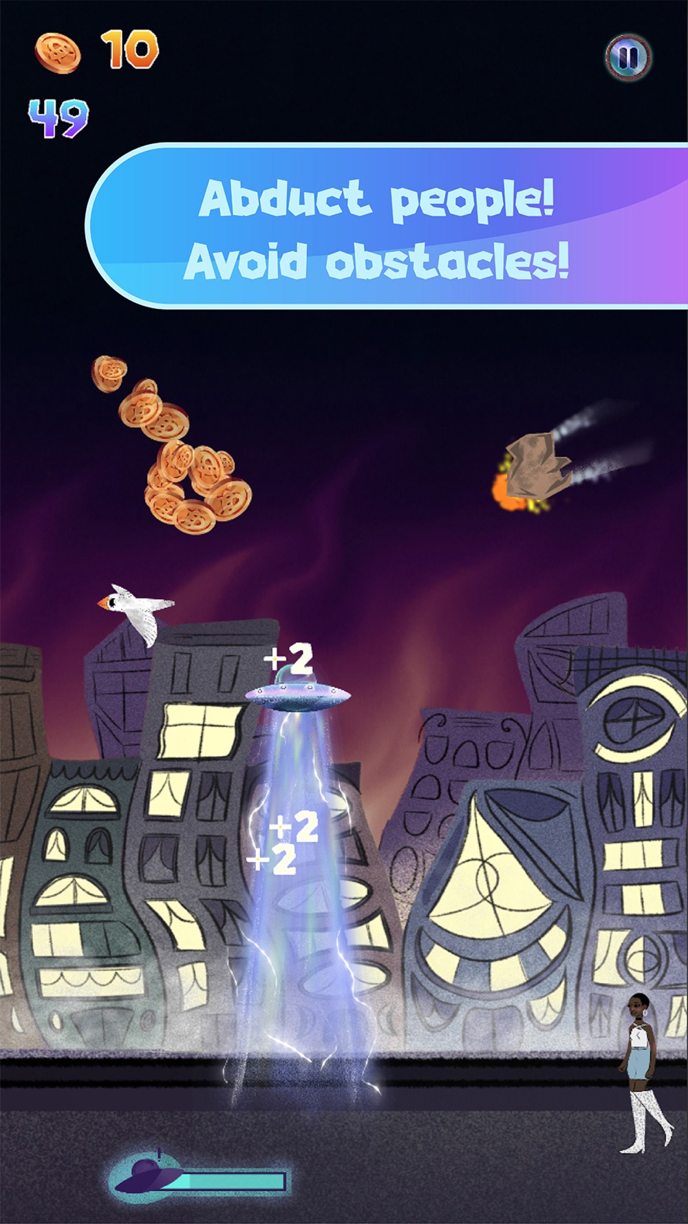 Abduct humans using your beam, gain score and get coins but be aware and avoid asteroids if you want to get better highscores!