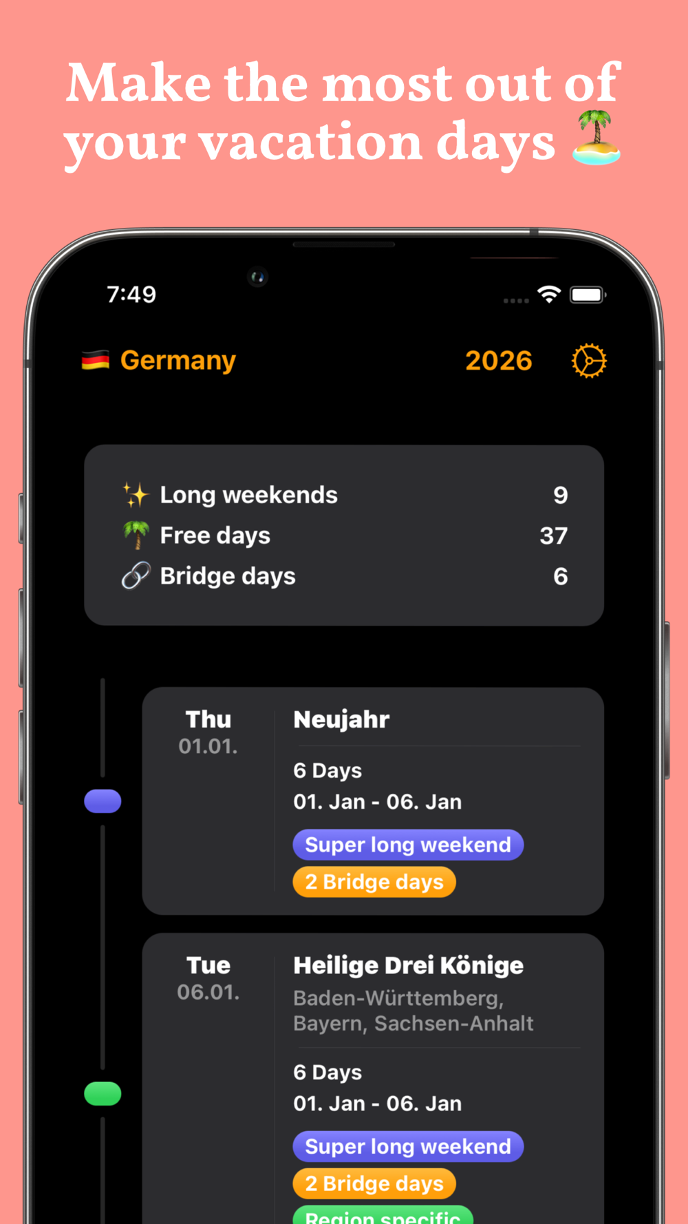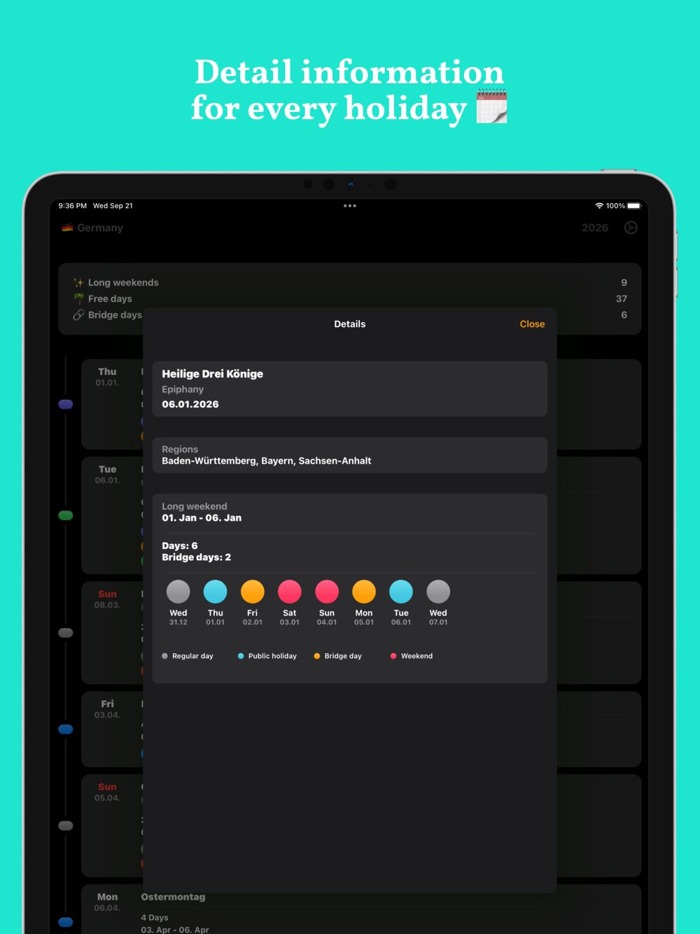 - Our algorithm calculates long weekends & bridge days for you.