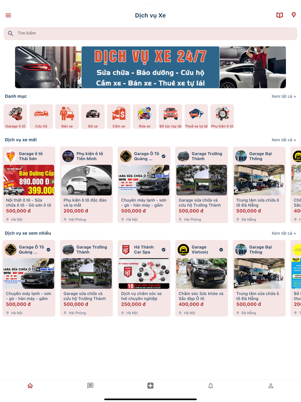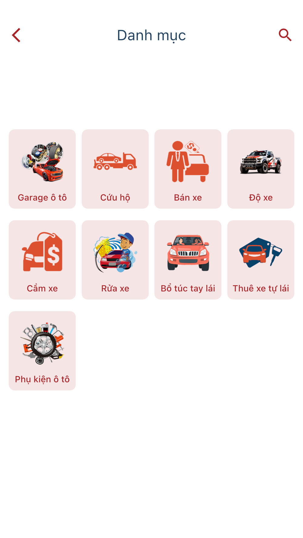 Tất cả dịch vụ cần thiết của ô tô đều nằm gọn trong điện thoại: Sửa chữa, Bảo dưỡng, Cứu hộ, Bán xe, Rửa xe, Độ xe, Cầm xe, Bổ túc tay lái, Thuê xe tự lái, Phụ kiện & đồ chơi ô tô...