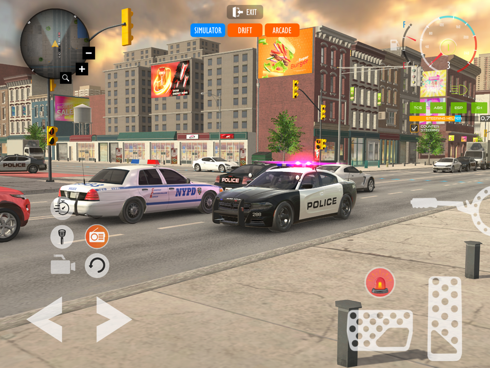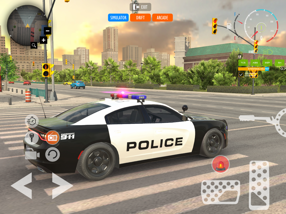 Thanks to the three buttons added to the top of the game, it is possible to change the physics of your police car as you wish. These buttons are arcade, drift and simulator buttons. The arcade mode in the game is available for the rapid return, the drift mode and the realistic driving impression in the simulator. This game is actually a police car drive game in the comprehensive simulation category. A simulation that both police game lovers and car game lovers cannot give up awaits you.