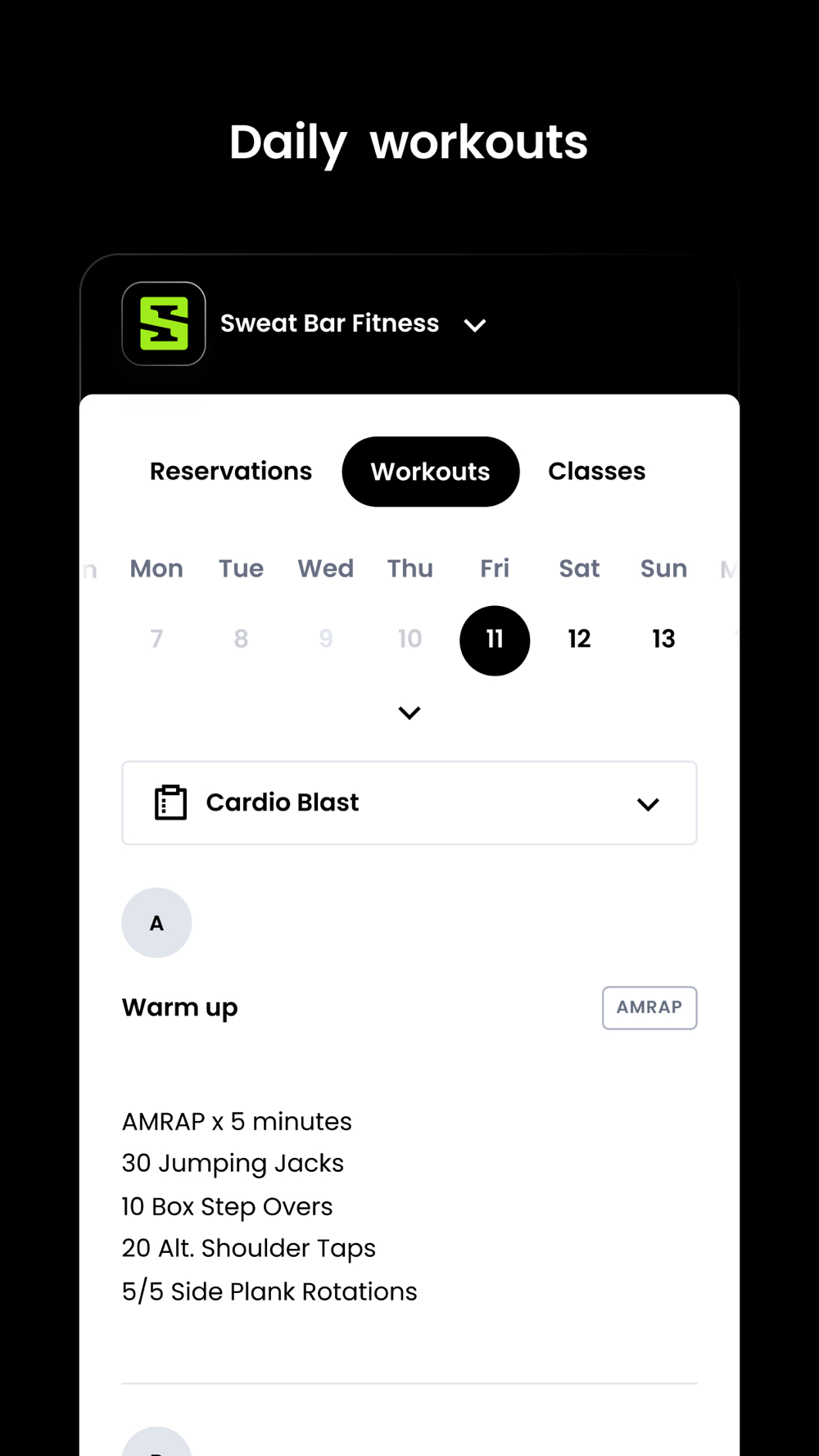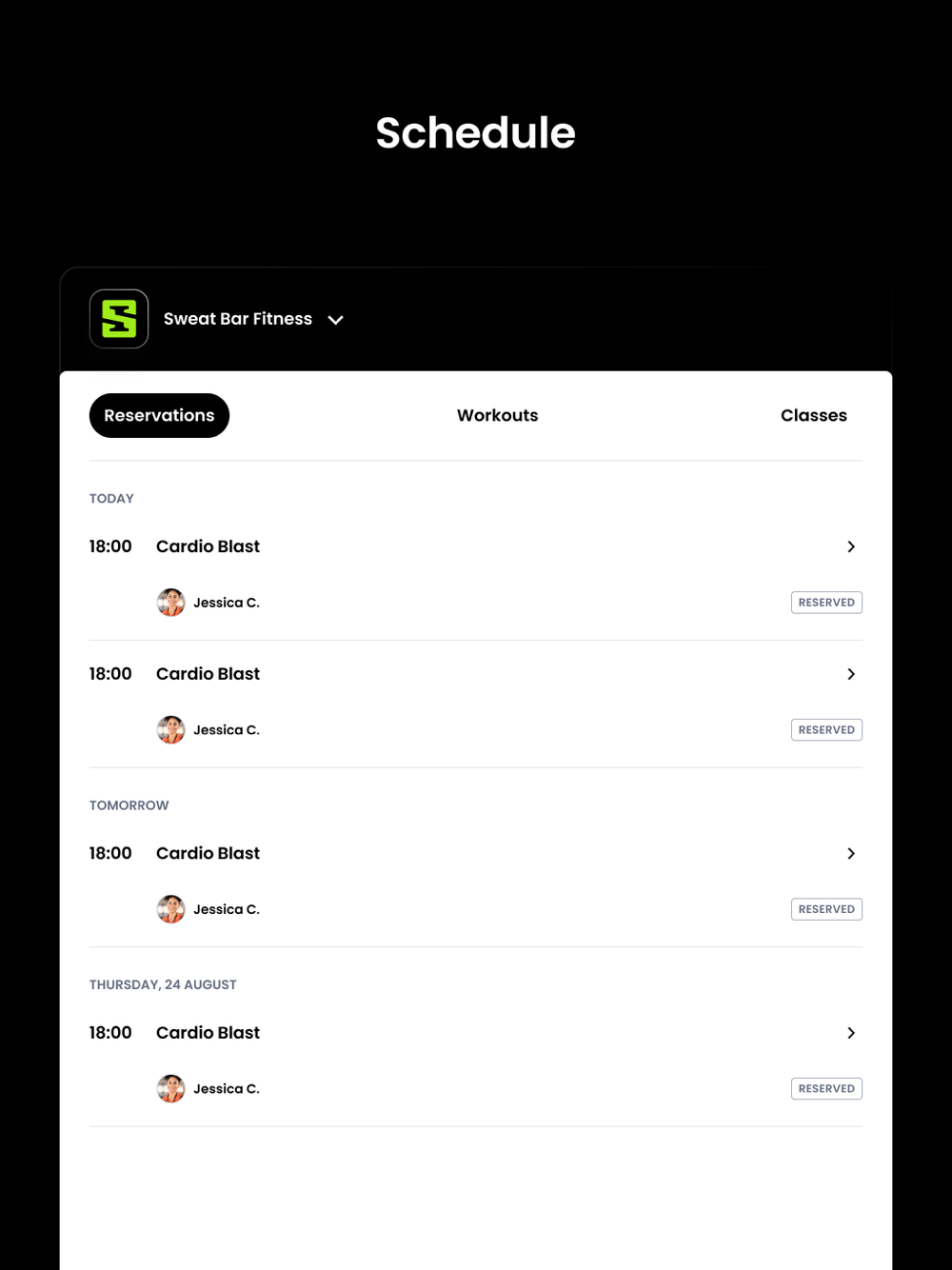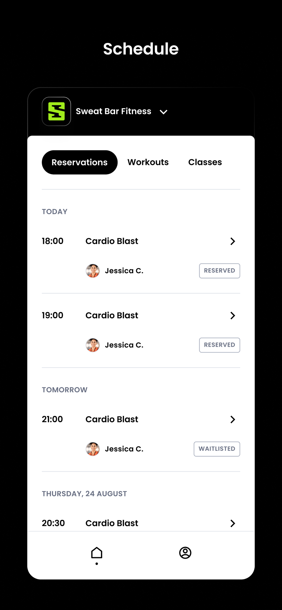 For members of Sweat Bar Fitness to reserve their place in a class, sign up for gym events, and general account management like updating headshots and credit card on file.