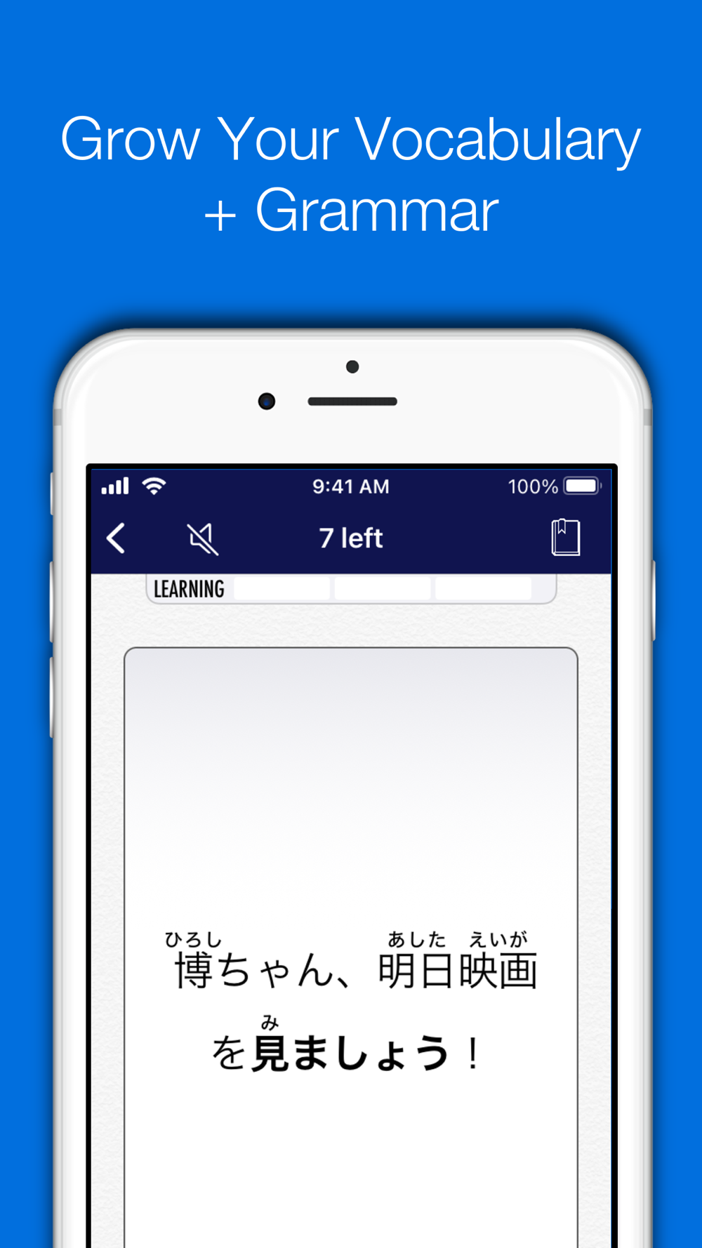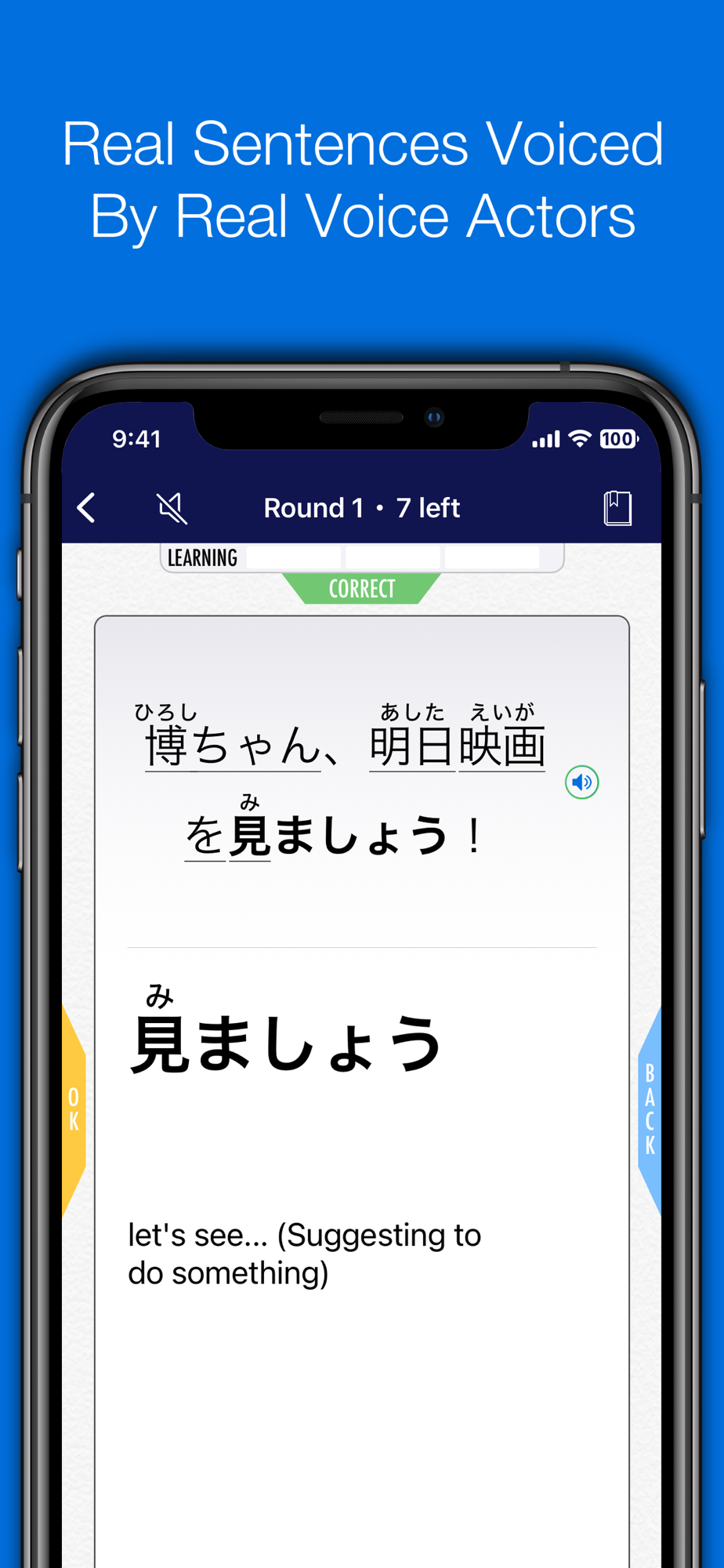 Instead of a traditional textbook, everything in Nihongo Lessons is in a flashcard format. Flashcards are easier to take in, easier to know how much to learn and how often to review, and simplify the mountain of information you need to absorb. Each flashcard introduces one new sentence for you to understand, and every new sentence introduces exactly one new word, grammar point, or concept. This keeps you constantly moving forward in your learning journey - never bored, never overwhelmed.
