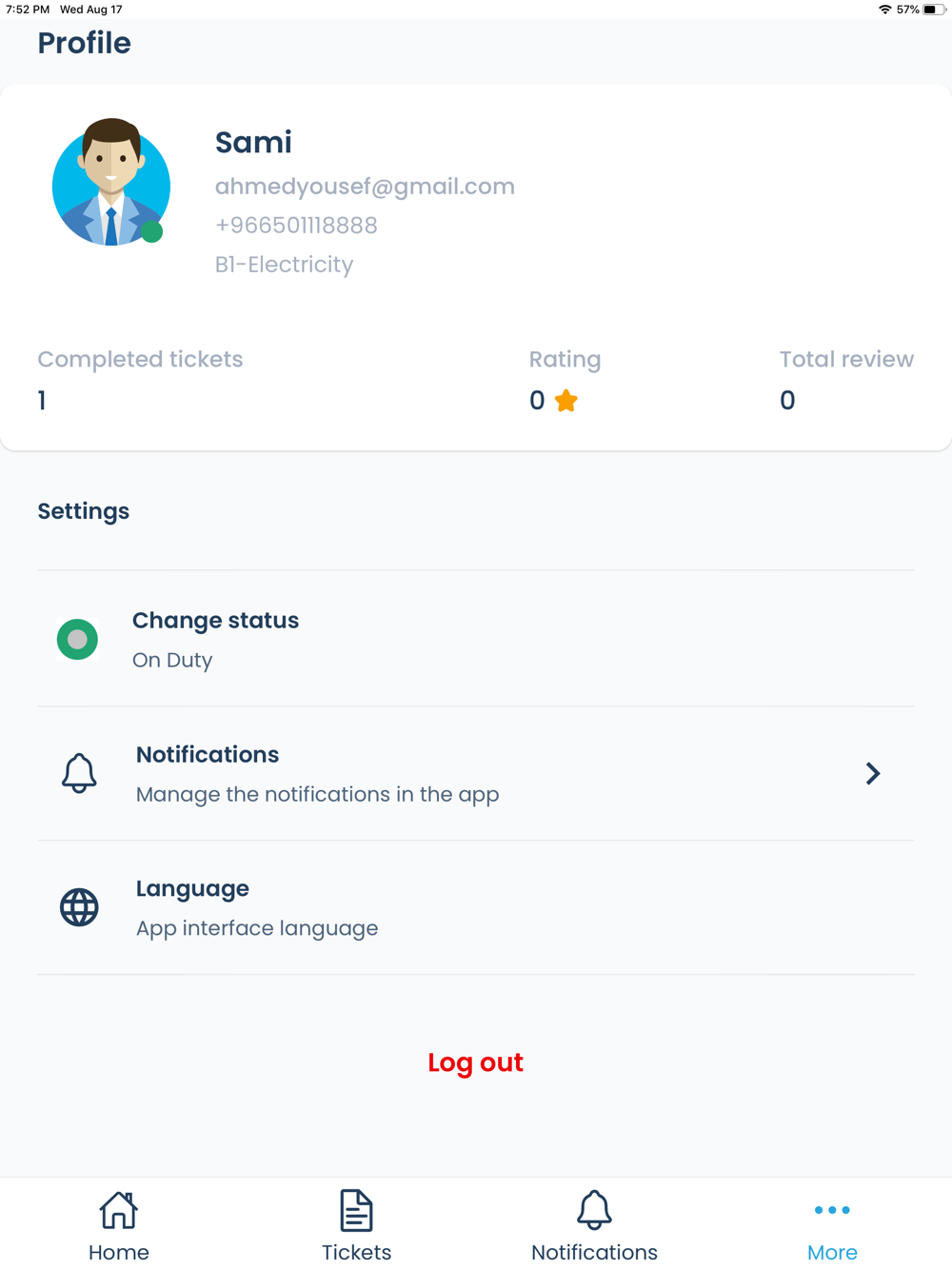 Harees enables the technicians to manage their tickets and they can change the status of the tickets and can chat with their supervisors, and also can show their rates.