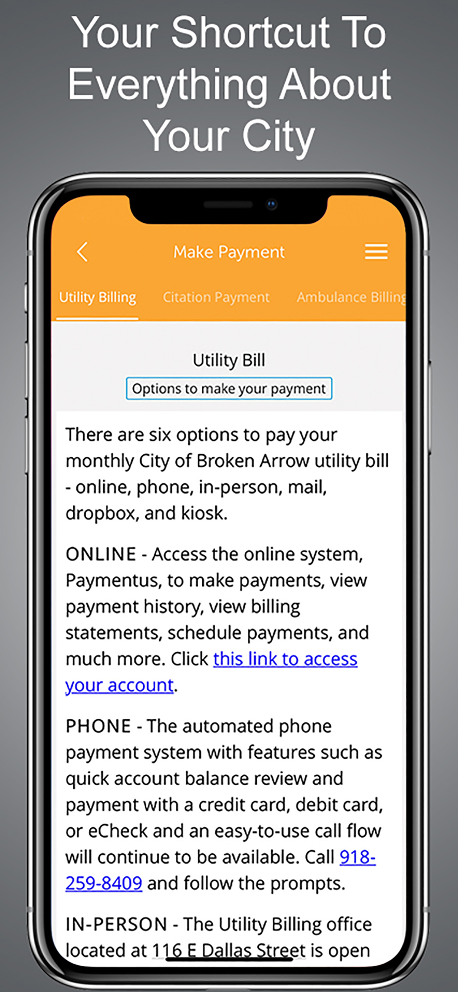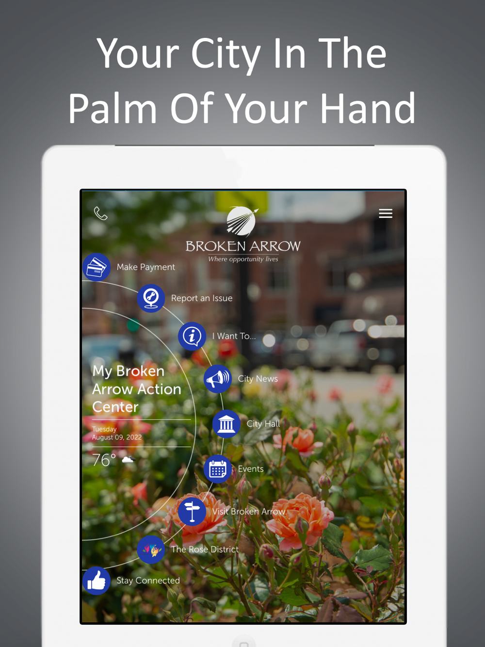 The My Broken Arrow Action Center app is your one-stop shop for the latest news, upcoming events, to make a utility payment, apply for a permit or license, report an issue or concern in the city, and much more. Download our free app today and begin exploring all that Broken Arrow, the city where opportunity lives, has to offer!
