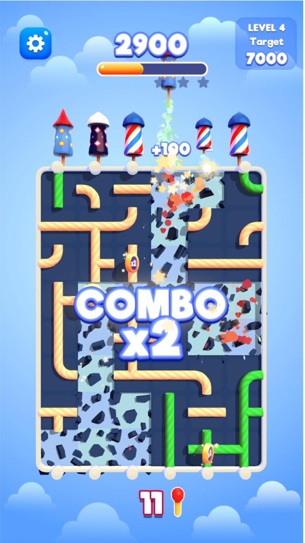 Rotate the fuse parts, and link them to create a path towards the rockets. Then, light them and enjoy!