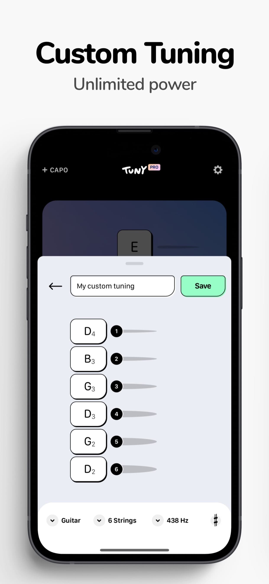 The app integrates all common tunings as well as many alternative tunings. Use the "Search" function to find what you're looking for quickly.