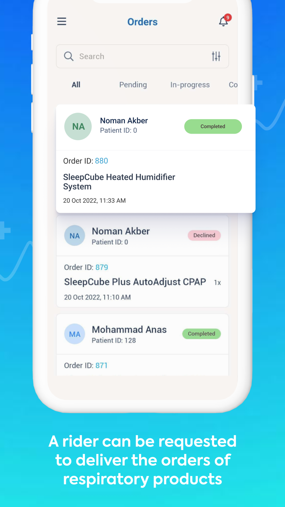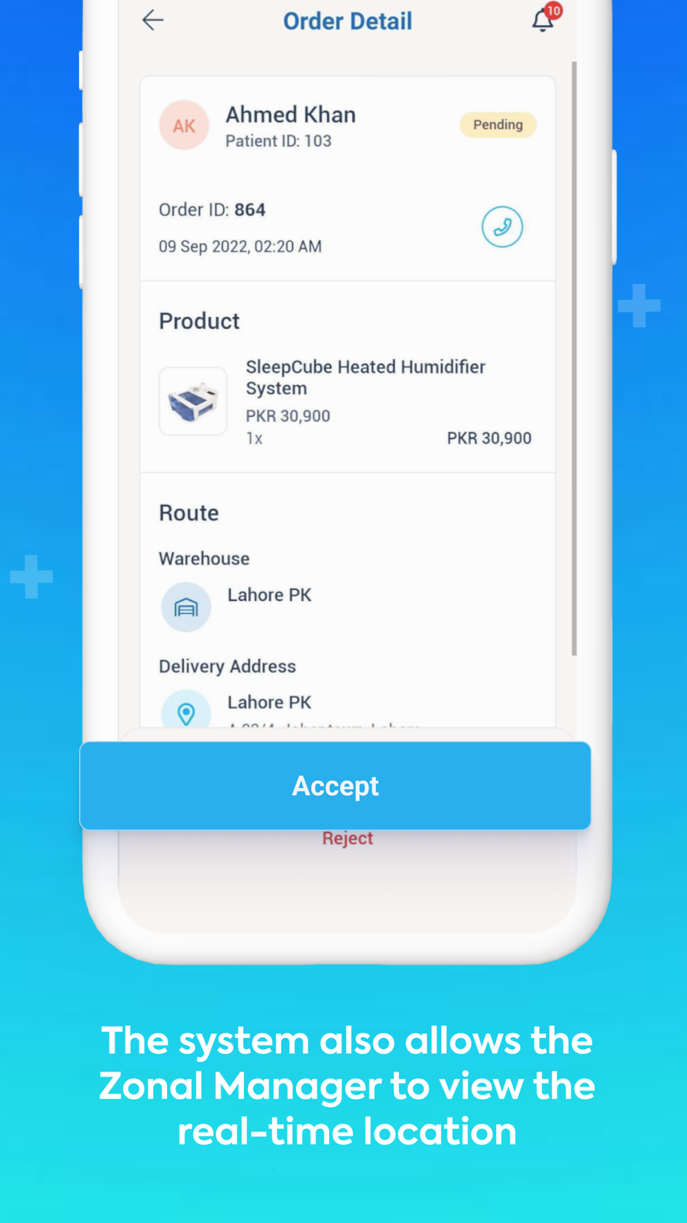 A rider can be requested to deliver the orders of respiratory products at any hour as required by the customer. The system also allows the Zonal Manager to view the real-time location of the rider on a map to track the progress or work status.