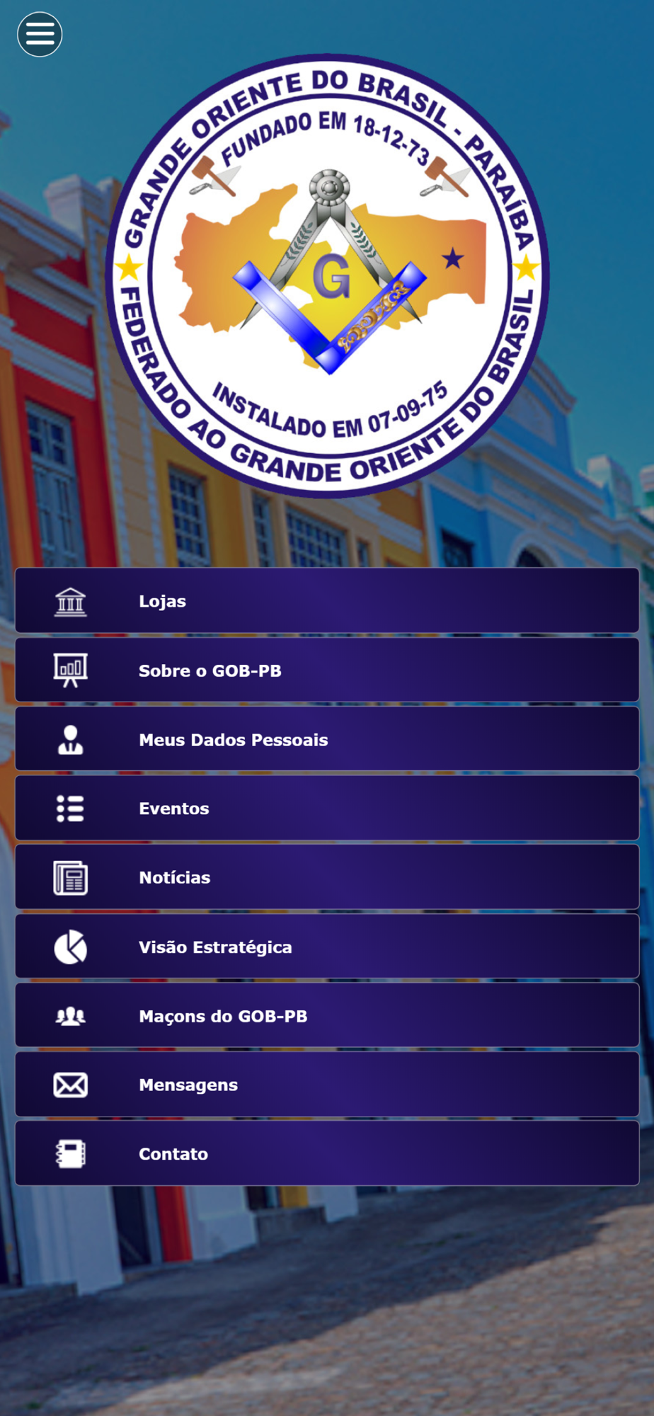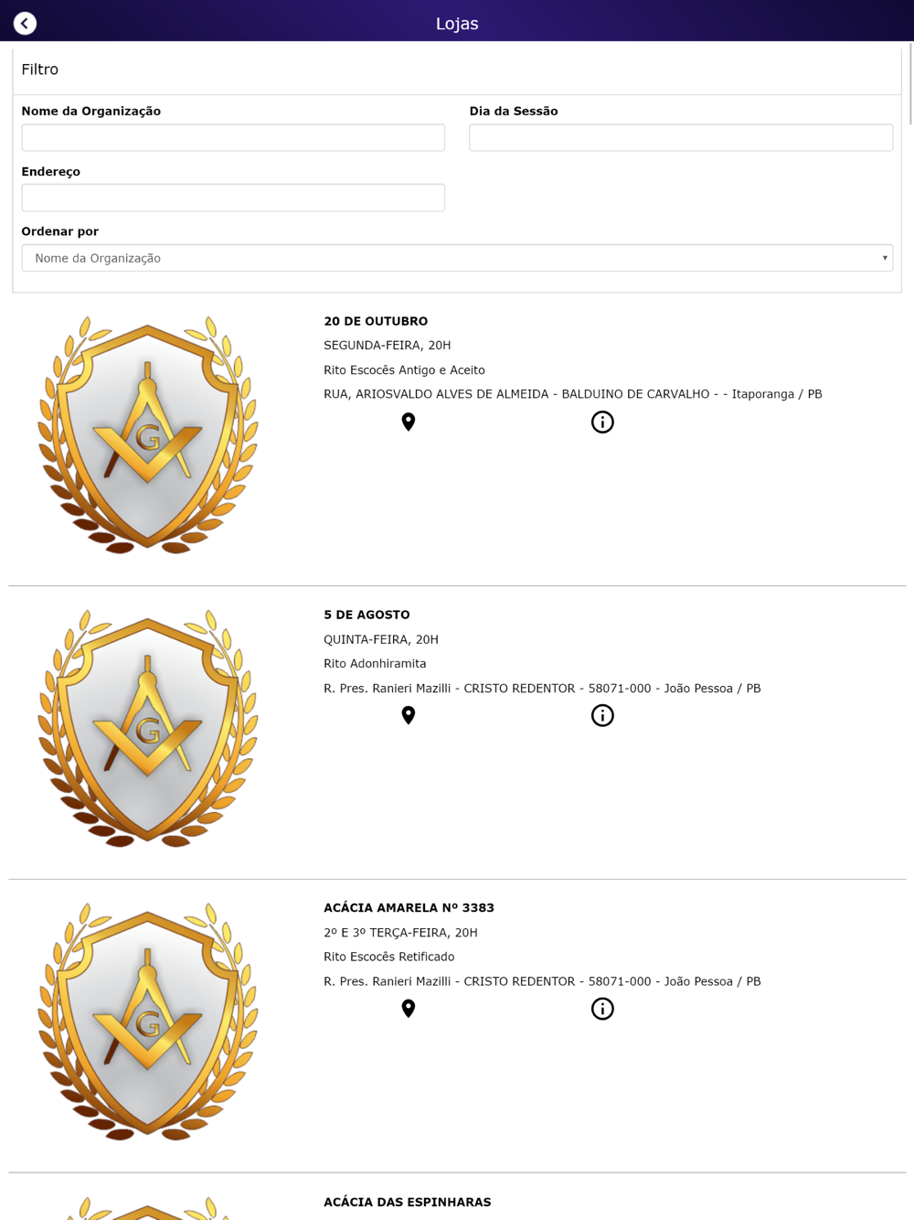 - Através do botão "Lojas" o usuário terá acesso as Organizações maçônicas que fazem parte da GOB-PB.