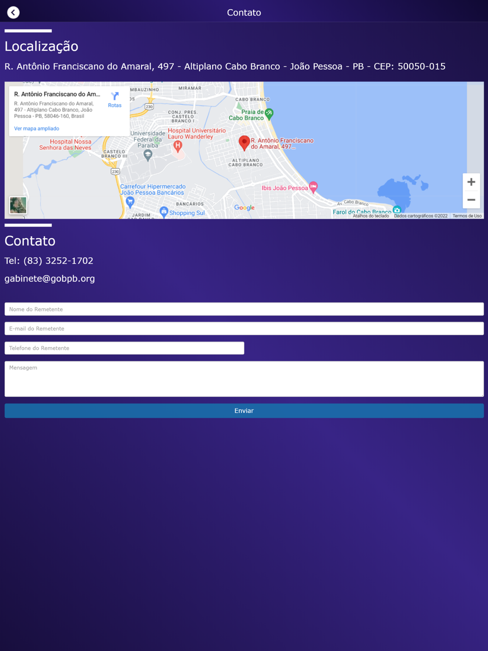 - Através do botão "Contato" o usuário terá acesso a informações de contato do GOB-PB.