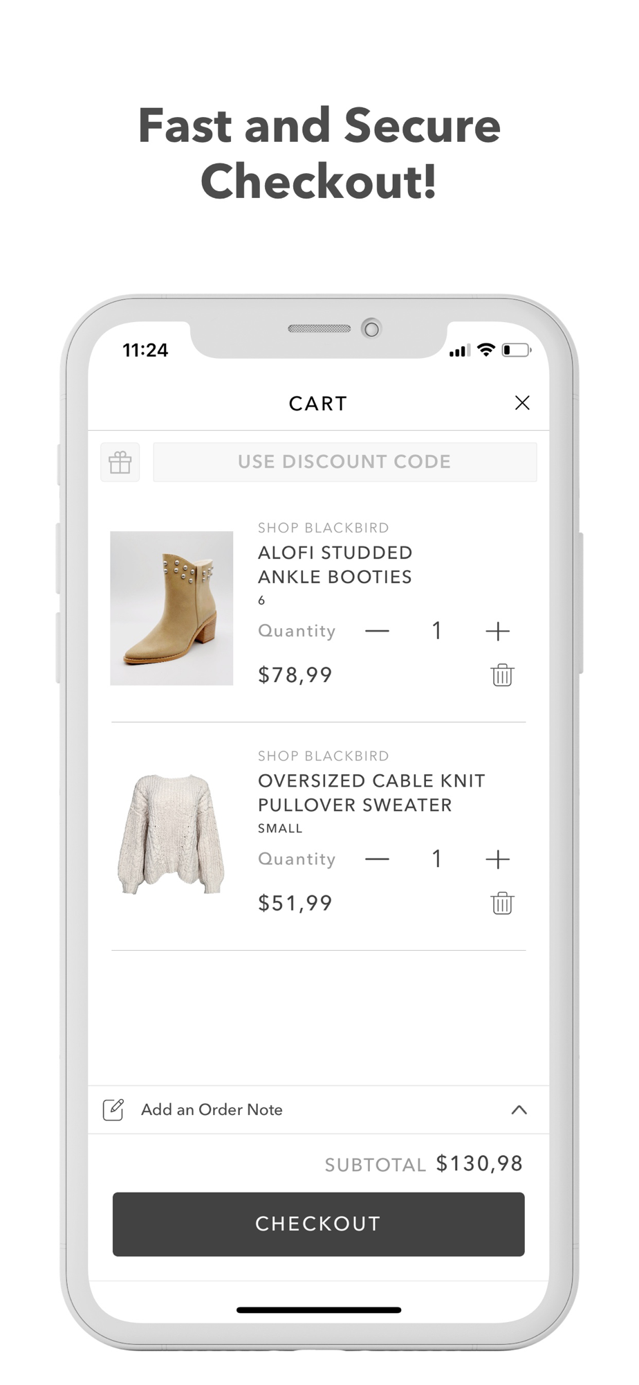 browsing new arrivals, specific collections, and deals; easy ordering and checkout; email