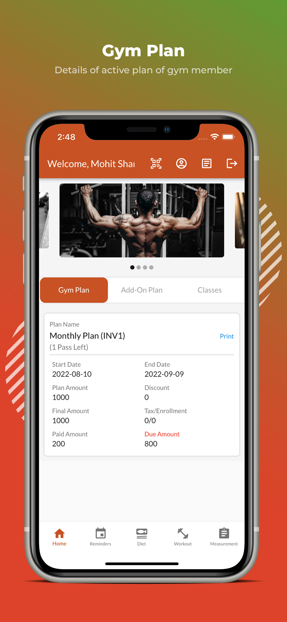 Exclusive gym app for Pravashni Fitness members, Gym member can login to the app with login details provided by gym at the time of membership registration at gym branch. Members can find their plan details, their measurements, also members can check their diet plan and exercise plans etc.