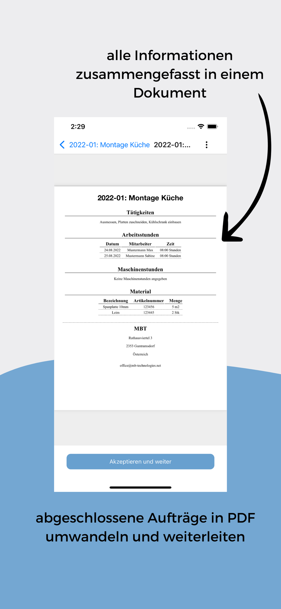 Durch die App kann der Betrieb einheitlich digitalisiert werden. Informationen können schnell abgespeichert und wieder abgerufen werden und am Ende eines Auftrags automatisch in ein PDF-Dokument verwandelt, unterschrieben und weitergeleitet werden. So wird Büroarbeit verringert und die gewonnene Zeit kann nachhaltiger in die Haupttätigkeiten des Unternehmens investiert werden.