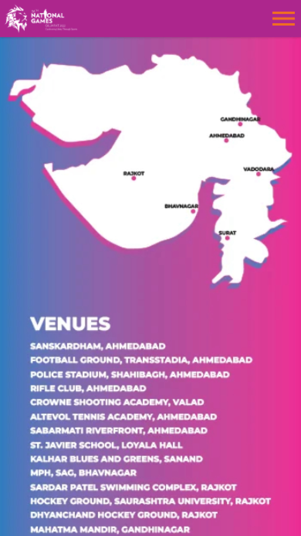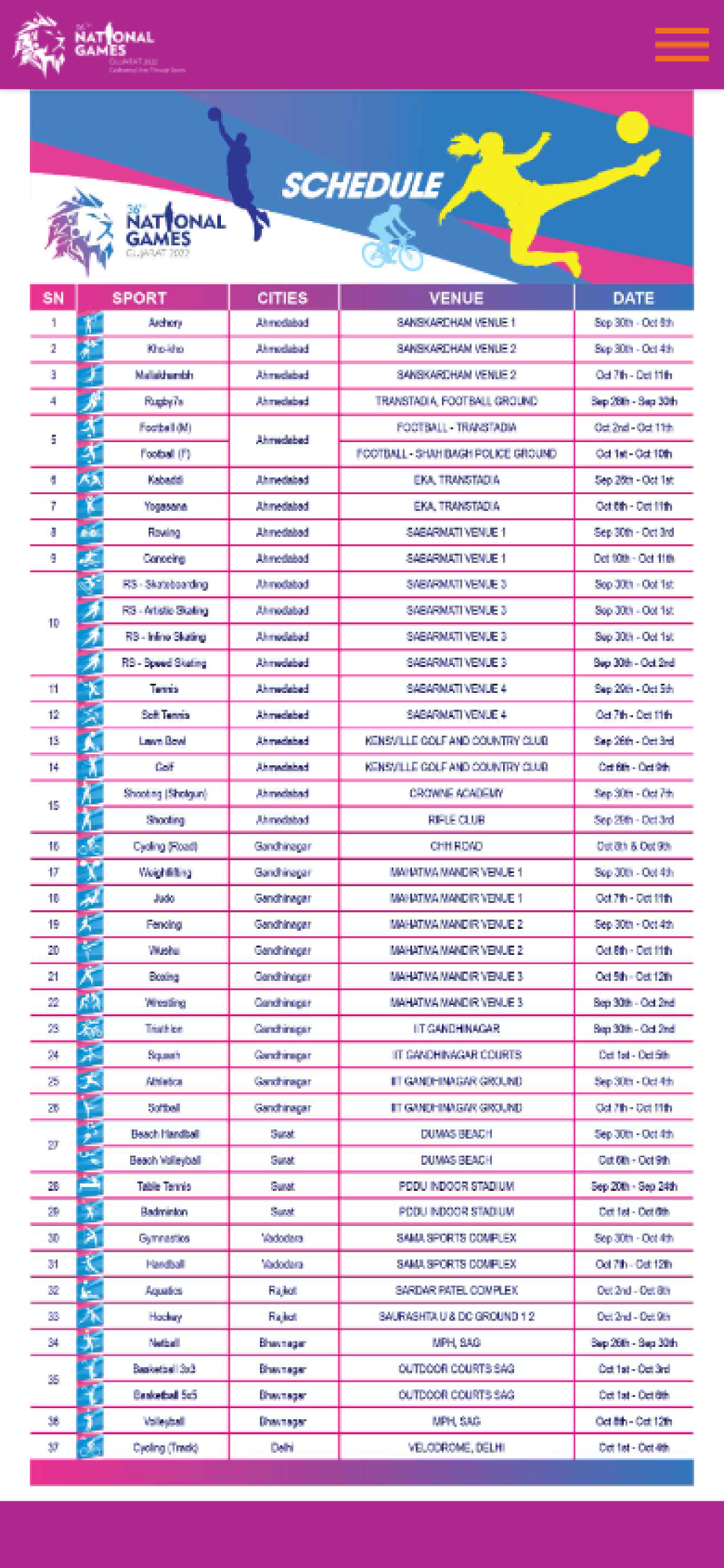 The 36th National Games will be hosted by Gujarat between September 27 and October 10, the first time the state is hosting the prestigious sporting event. After a gap of seven years, the event will be held in six cities – Ahmedabad, Gandhinagar, Surat, Vadodara, Rajkot and Bhavnagar.