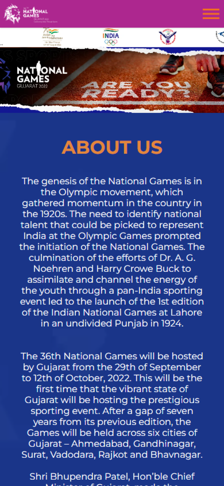 The genesis of the National Games is in the Olympic movement, which gathered momentum in the country in the 1920s. The need to identify national talent that could be picked for the Olympic Games prompted the initiation of the National Games. The culmination of the efforts of Dr. A. G. Noehren and Harry Crowe Buck to assimilate and channel the energy of the youth through a pan-India sporting event led to the launch of the 1st edition of the Indian Olympic Games at Lahore in an undivided Punjab in 1924.