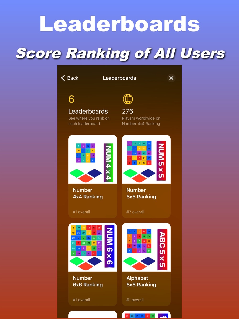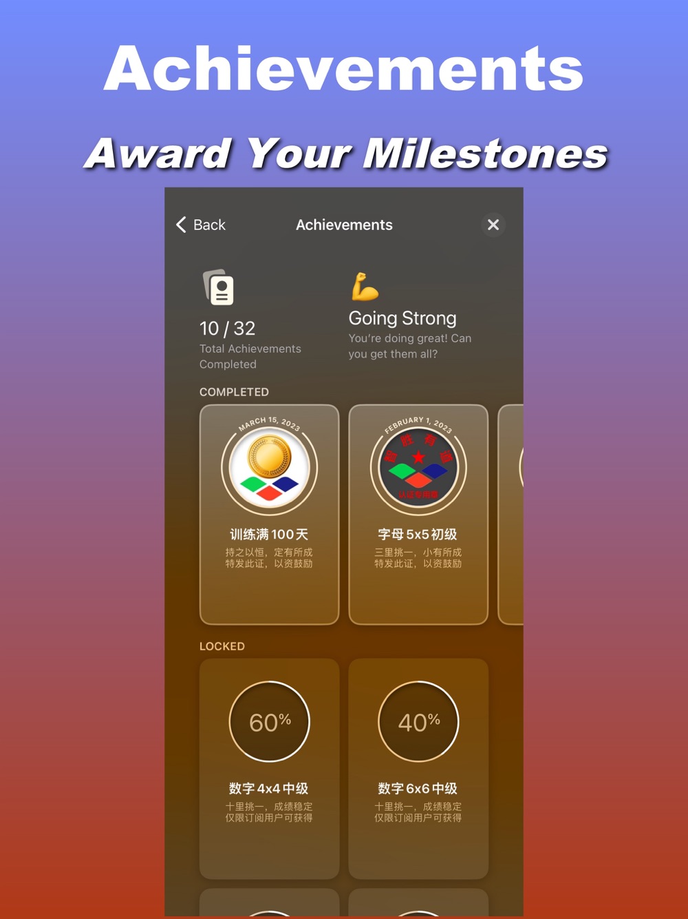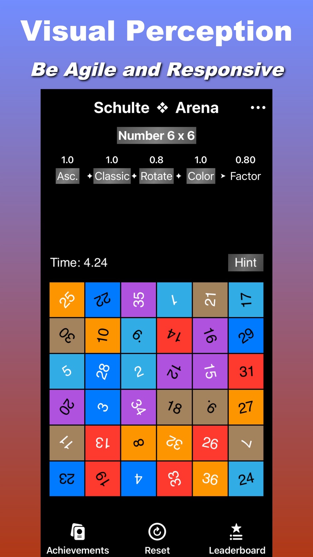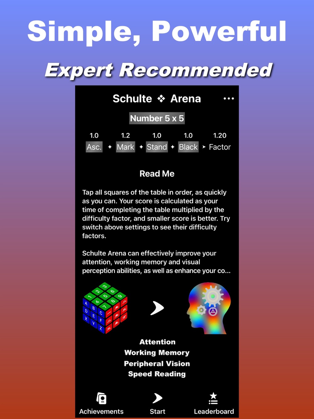 Schulte Arena features multiple training modes to specifically and effectively train your attention, working memory and visual recognition and response in dynamic environments. It supports Number table (4x4, 5x5, 6x6), Alphabet table (5x5) and Chinese Idioms table (4x4, 6x6, and 6000+ idioms are covered).