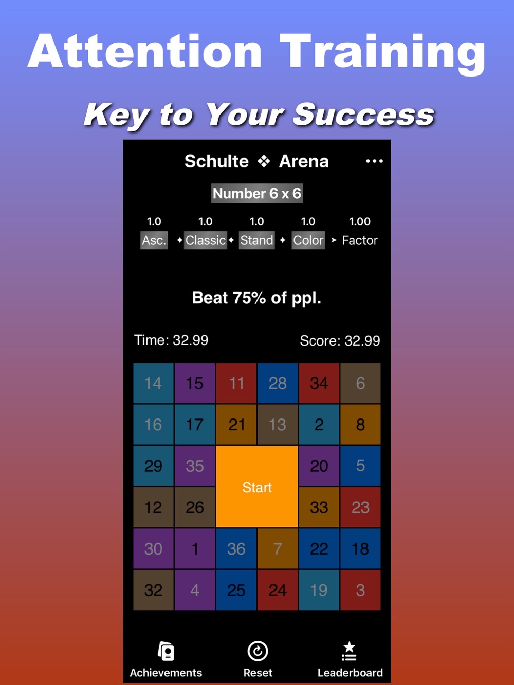 Schulte Arena goes beyond traditional Schulte Table apps. It helps you train your attention and working memory. Attention and working memory are crucial for everyday living and learning. Attention is the process that allows us to take information in. It also helps us select useful information. Think of it as a funnel. It gathers what we need to know and channels it into our brain. After gathering information, the attention funnel feeds it into the brain’s short-term storage bucket. This is where new information is first held. Experts call this process “encoding.” This is also where the brain manipulates new information so it’s useful. This process is called “working memory.” Working memory is an active and fairly instant process. It allows us to use new and learned information while we are in the middle of an activity.