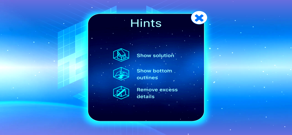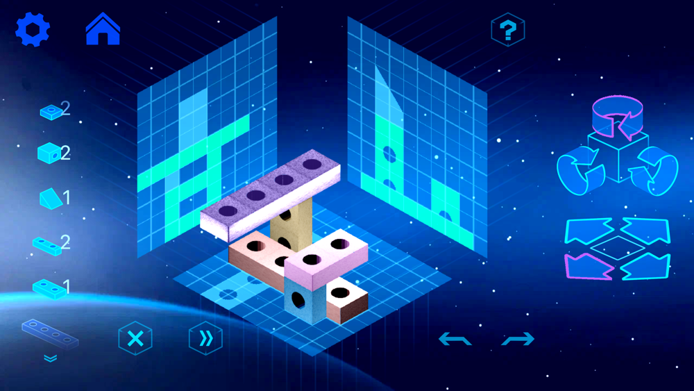 The action takes place somewhere beyond the stars in an outer galaxy. Cosmic shuttle has to build complex and unusual 3D models based on drawings of shadow patterns on 3D axis planes.