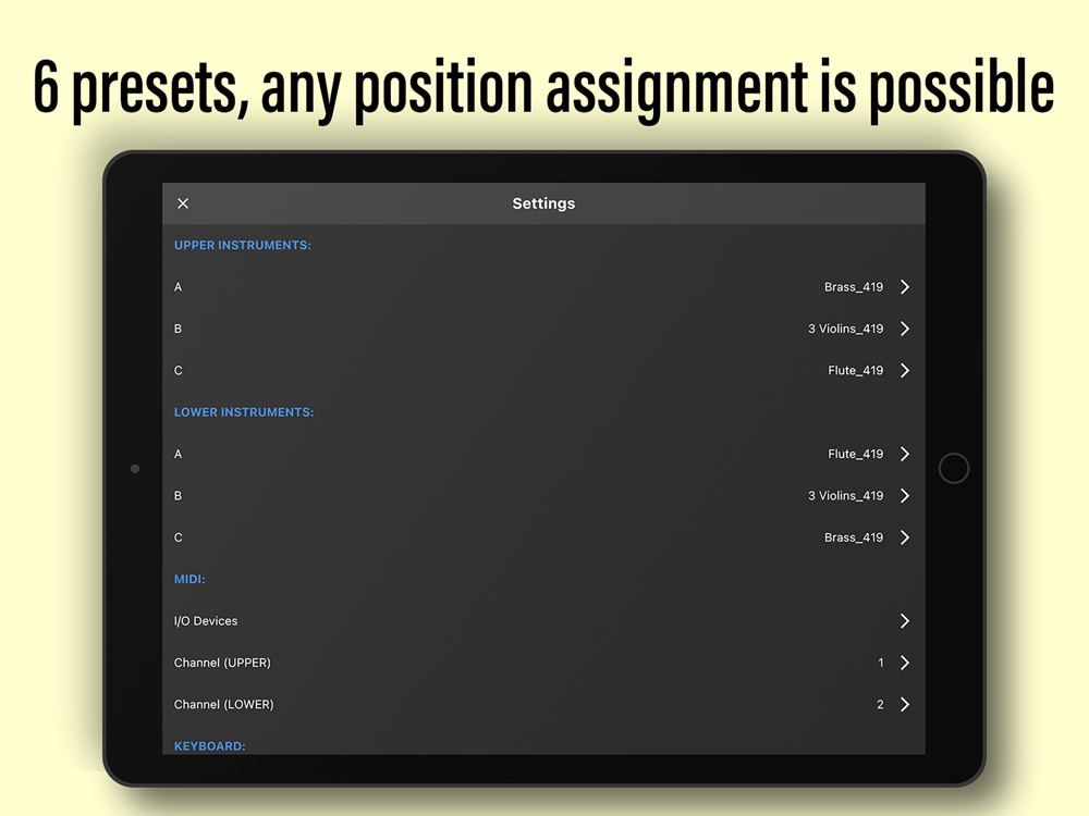 - 6 instrument sounds can be set as the favorite position of A,B,C position on setting screen
