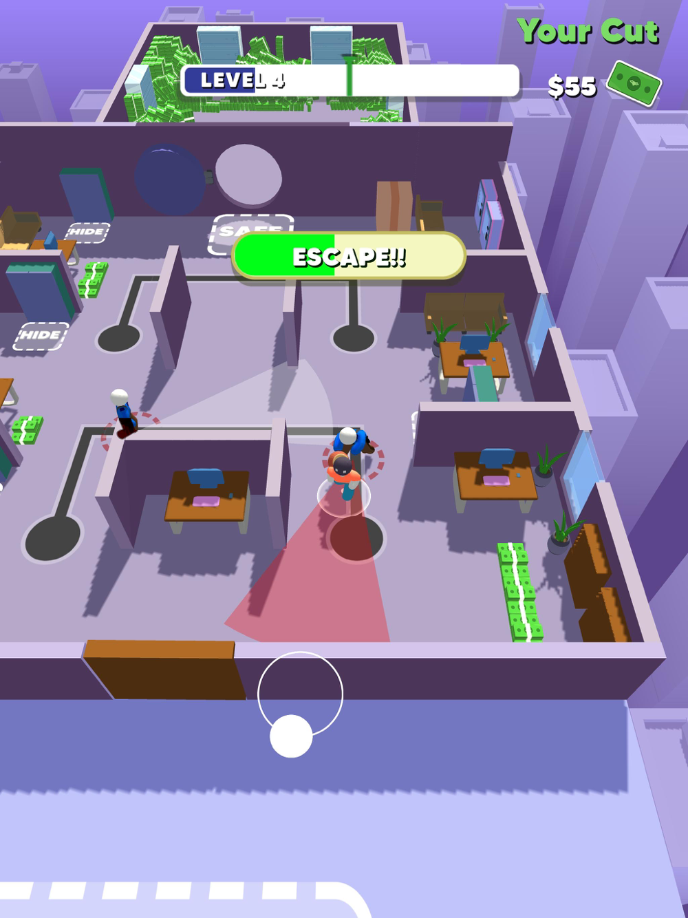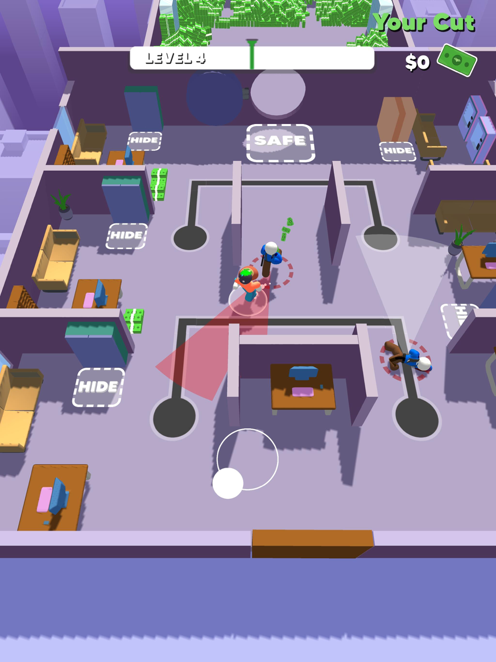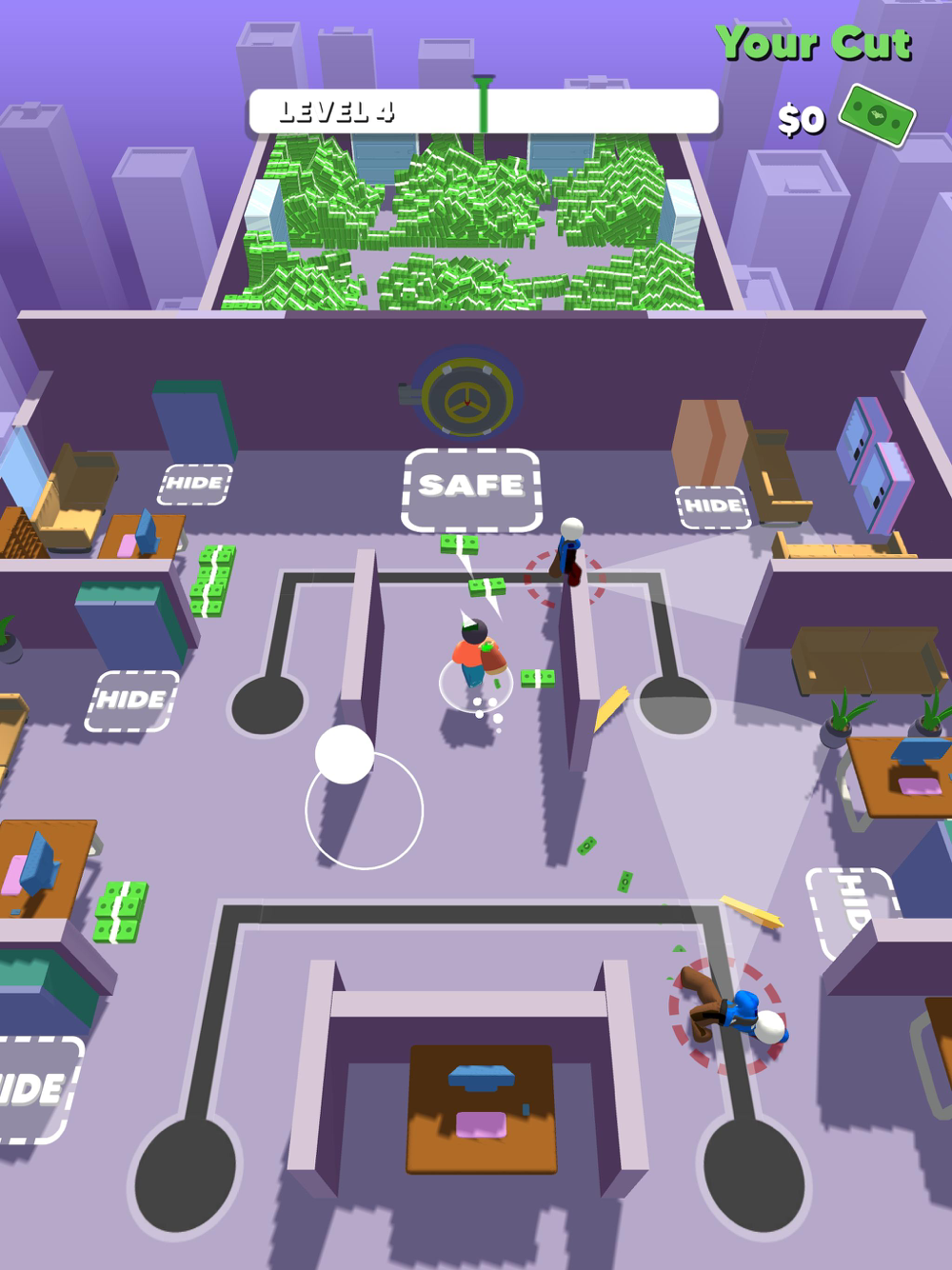 Are you up for the job? Plan your heist strategically. Execute it perfectly. Eliminate or hide from the guards. Take as much money as you can and be rich the easy way.