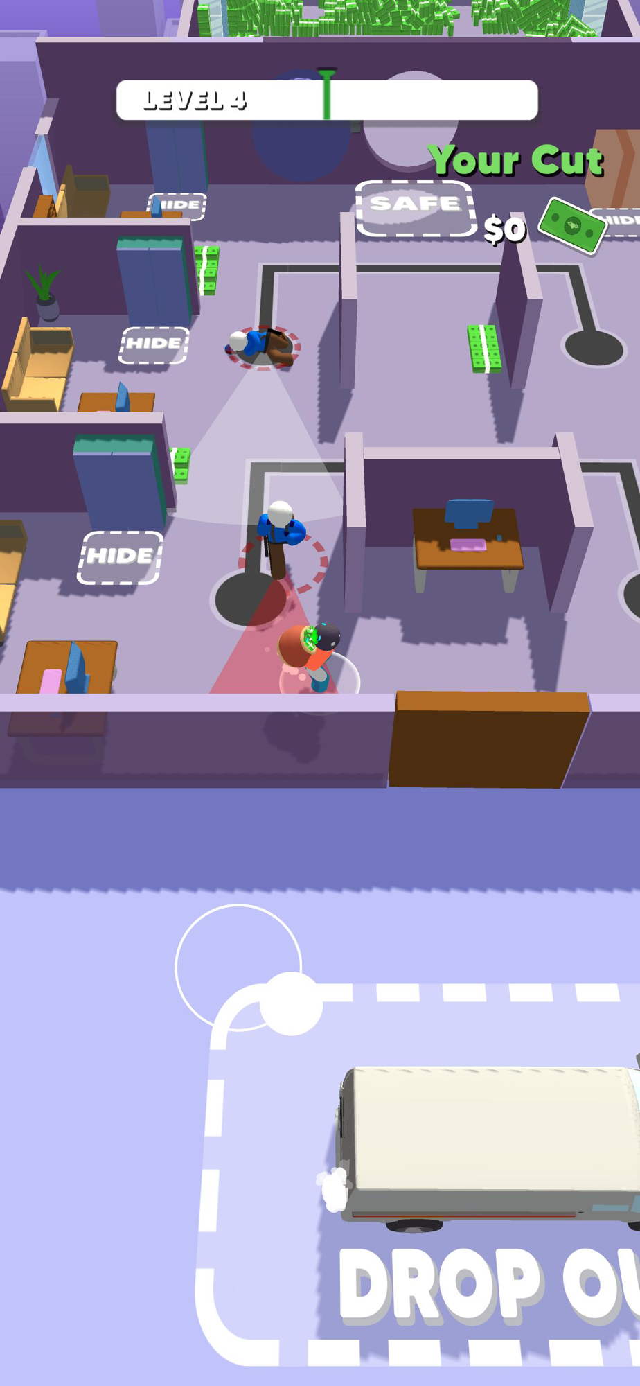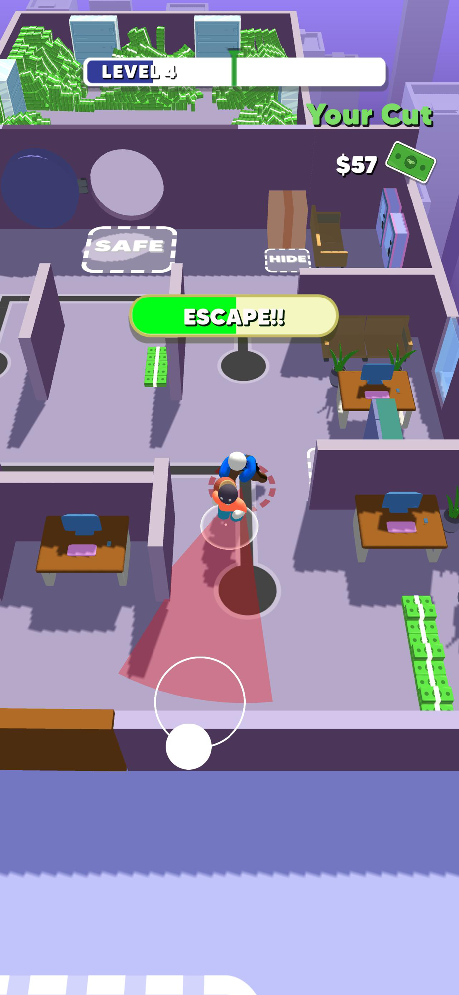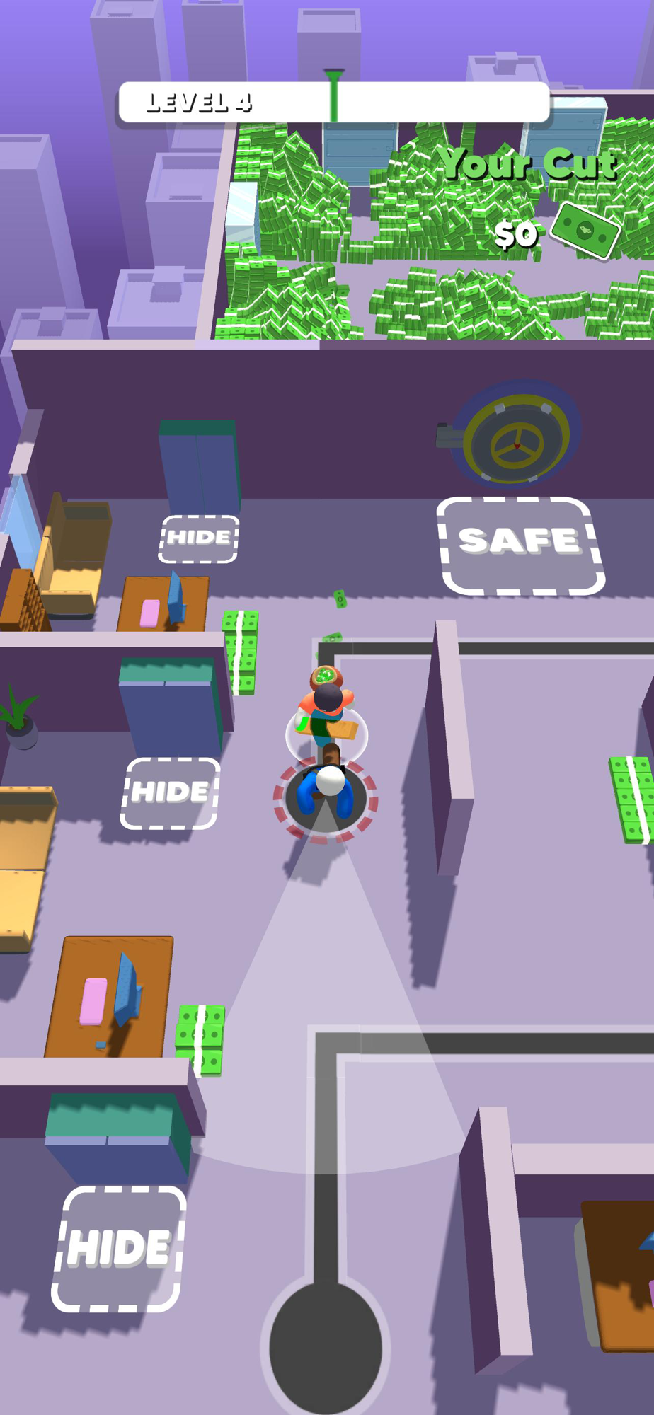 Are you up for the job? Plan your heist strategically. Execute it perfectly. Eliminate or hide from the guards. Take as much money as you can and be rich the easy way.