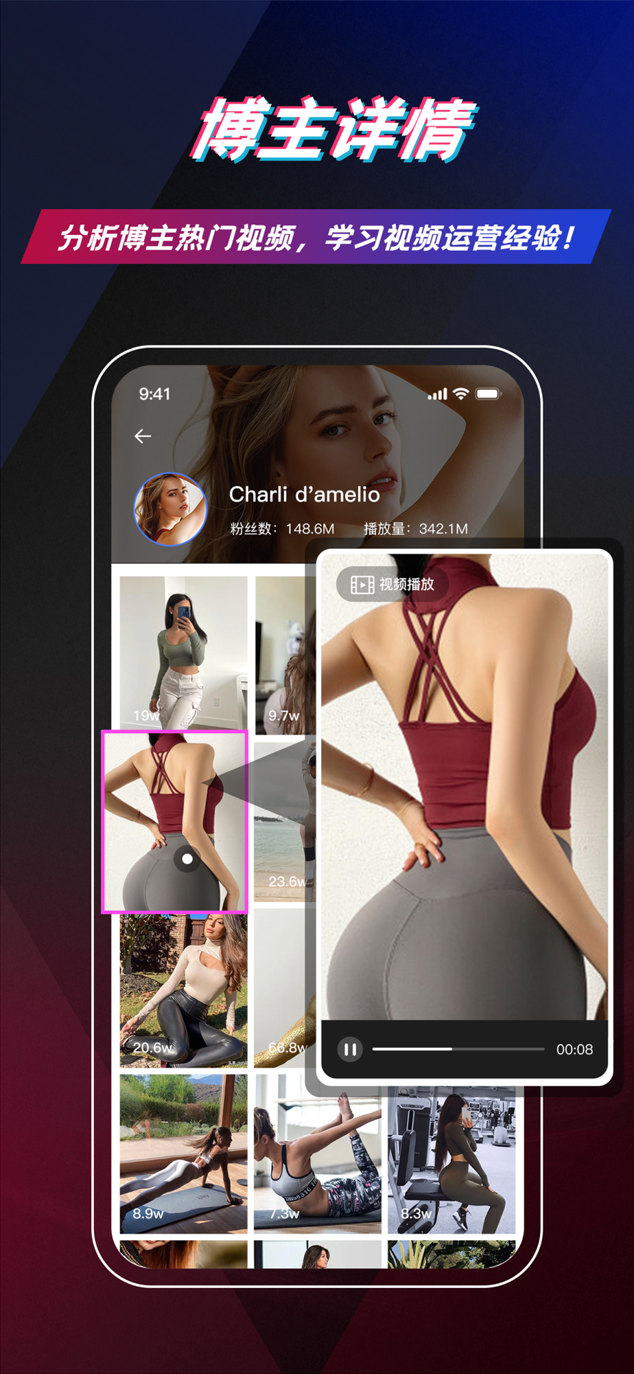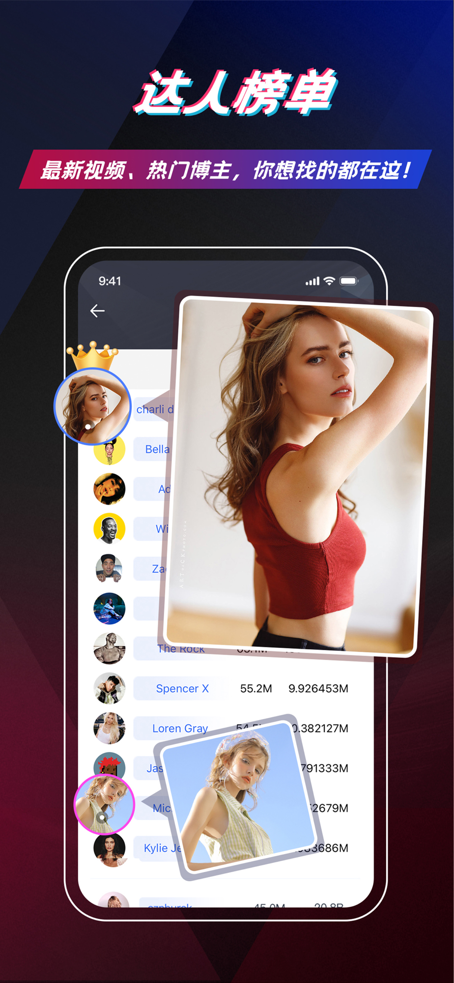 2、通过热门博主查看榜单,获悉人们喜欢的博主红人,掌握流量的密码!学习模仿网红达人,快速制作爆量短视频!让您快速拥有海外短视频的极佳嗅觉与网感.