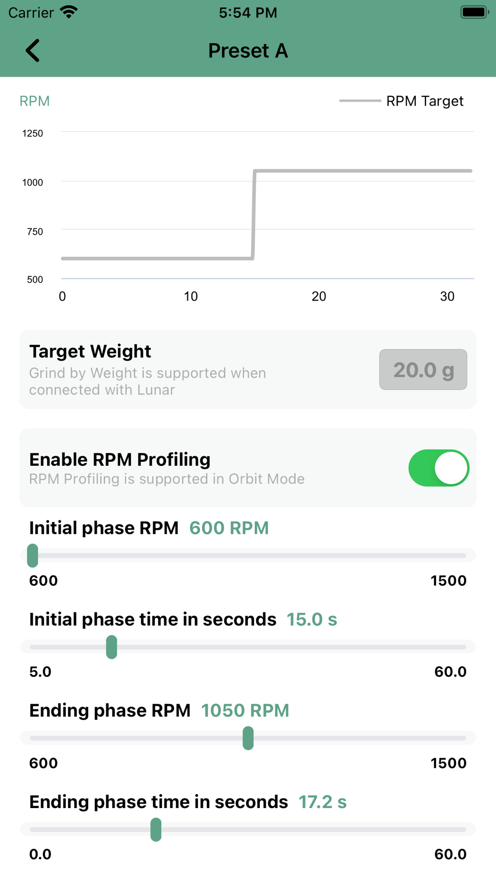 One of the key features of the companion app is the ability to adjust your grinder with finite detail. Even when not connected to your grinder, you can set three grinding programs by both speed and target weights. In a dedicated section, choose your target weight, enable RPM profiling, and receive readings from previous sessions. Receive data about every grind you perform.