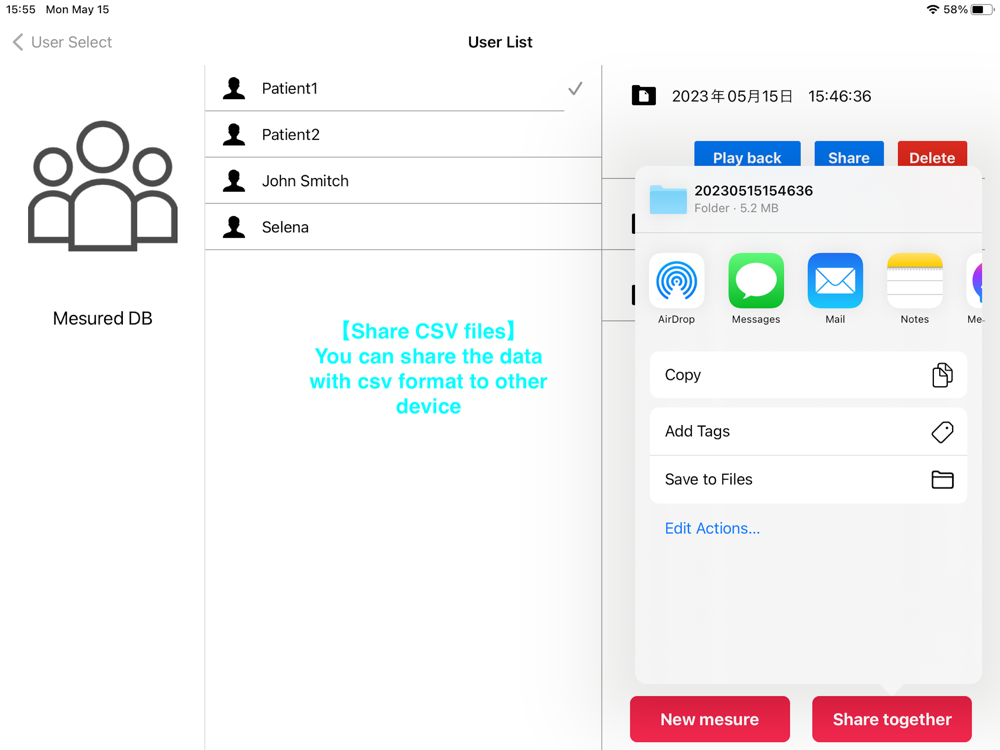 Since it is a digital goniometer application between two segments, when applied to the human body, the relative angle between the parts where the sensor is attached can be obtained as 3-axis data. Sensor data can be monitored in real-time while being recorded on an iPad. In addition, by enabling video recording with the device’s video camera, it is possible to synchronize sensor data and video and play back after measurement. In addition, the resulting data can be output externally as CSV.