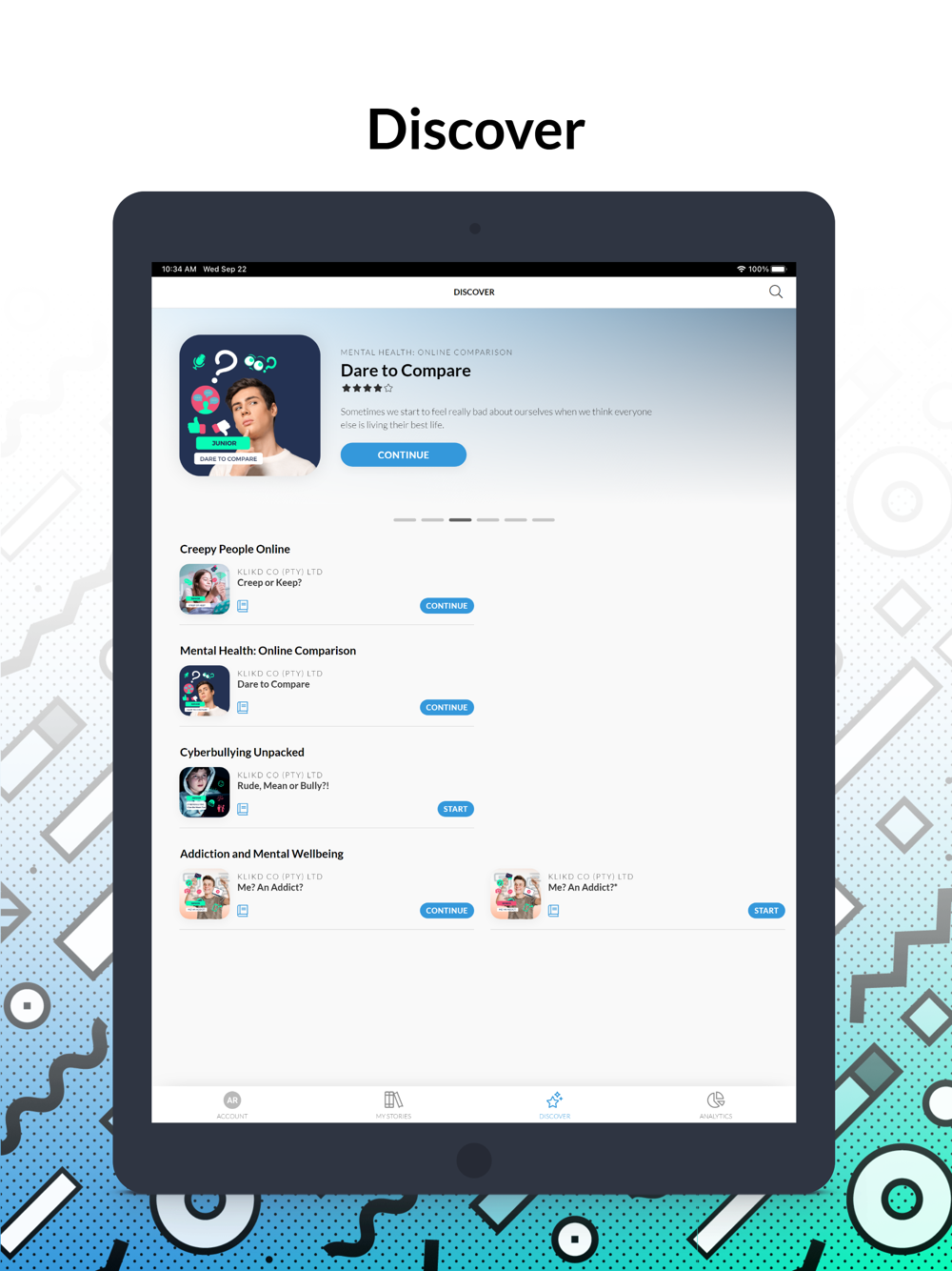 Discover stories from real teens just like you, watch engaging animated videos and get practical tips on how to enjoy social media mindfully while being a responsible digital citizen. Each module is paired with interactive quizzes and tasks. Completion of all the modules on the Klikd app will provide you with your customised Social Media License - a personalised checklist of your own triggers, strengths and weaknesses when it comes to social media.