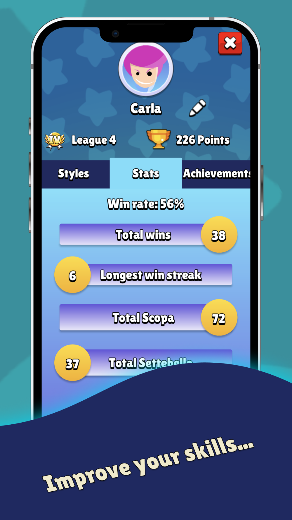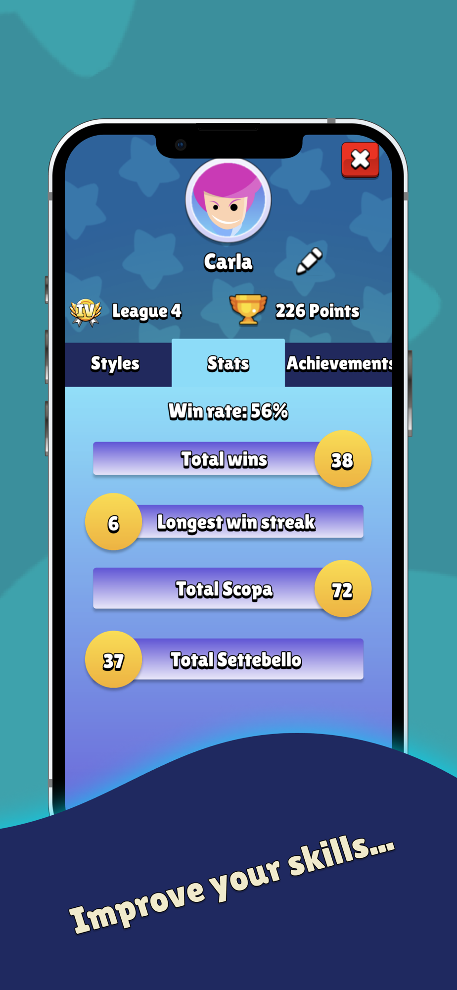 Choose a fun avatar and customize your playtime with different boards, decks and many types of cards, from classic ones to our own exclusive Scopa! cards: