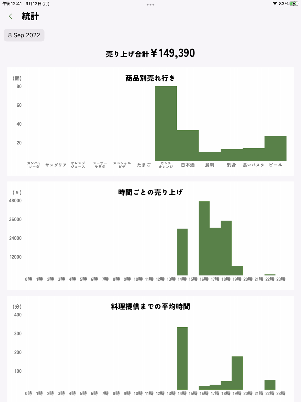 ・注文履歴、グラフ(商品別の売れ行き、1日の売り上げ合計などを確認することができます。)