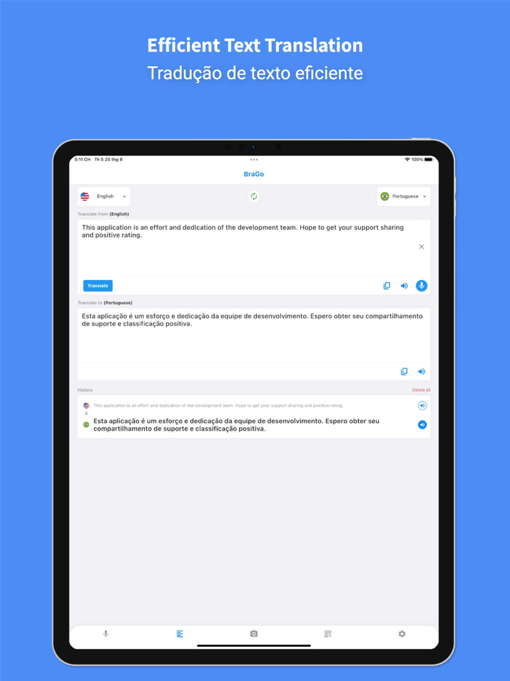 Hi ! BraGo is the leading Brazilian portuguese Translator with a lot of outstanding features such as accurate voice translator, translate any text in 45 languages to Brazilian portuguese or Brazilian portuguese to any language and extremely useful photo translating feature or learn speaking Brazilian portuguese more easily.