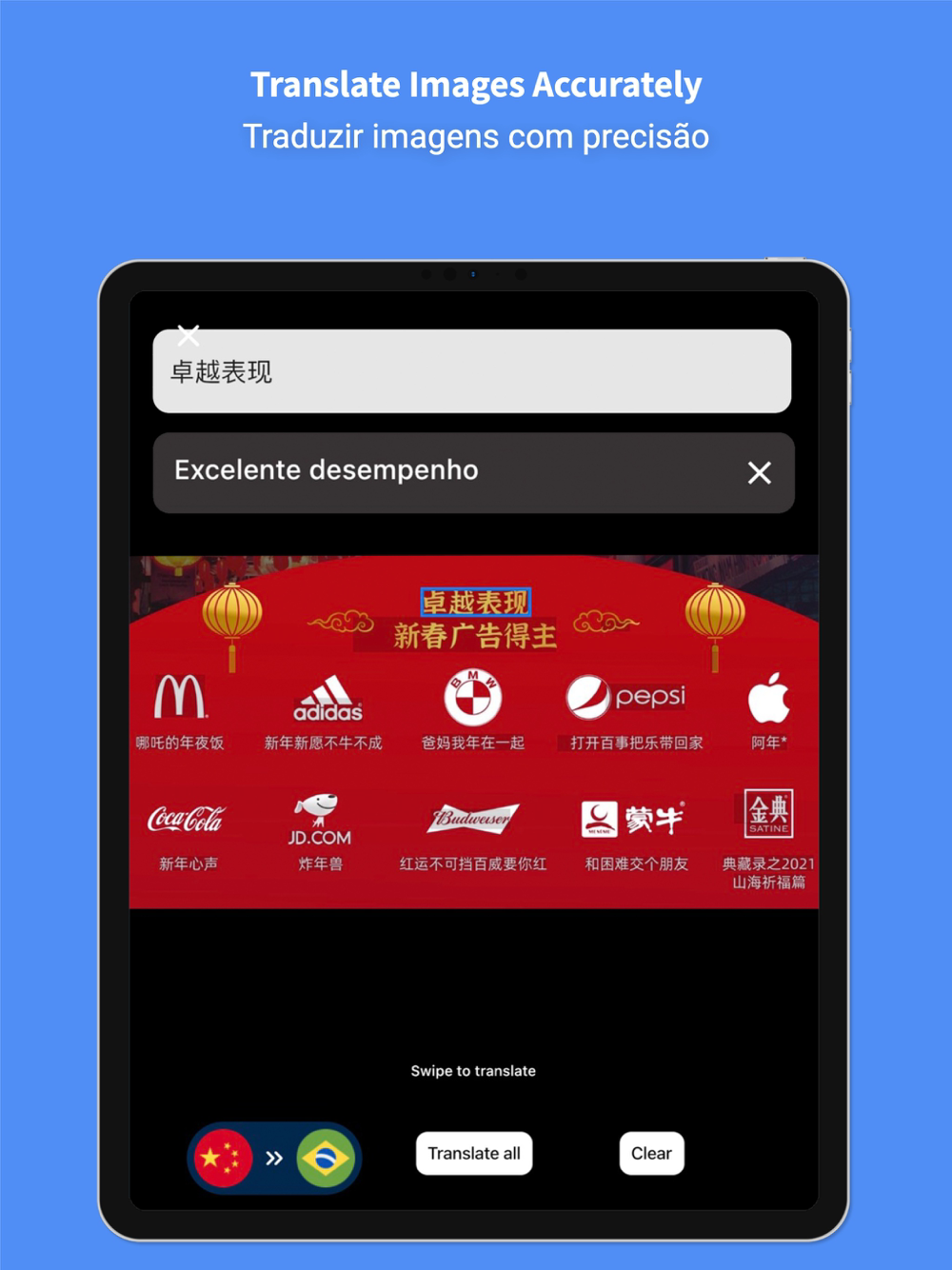 • Use your camera to instantly translate menus or signs and more from any language to Brazilian portuguese.