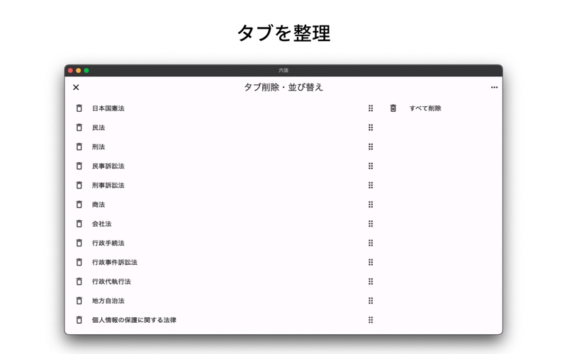 タブ表示で最新法令を閲覧できる六法全書アプリ。
