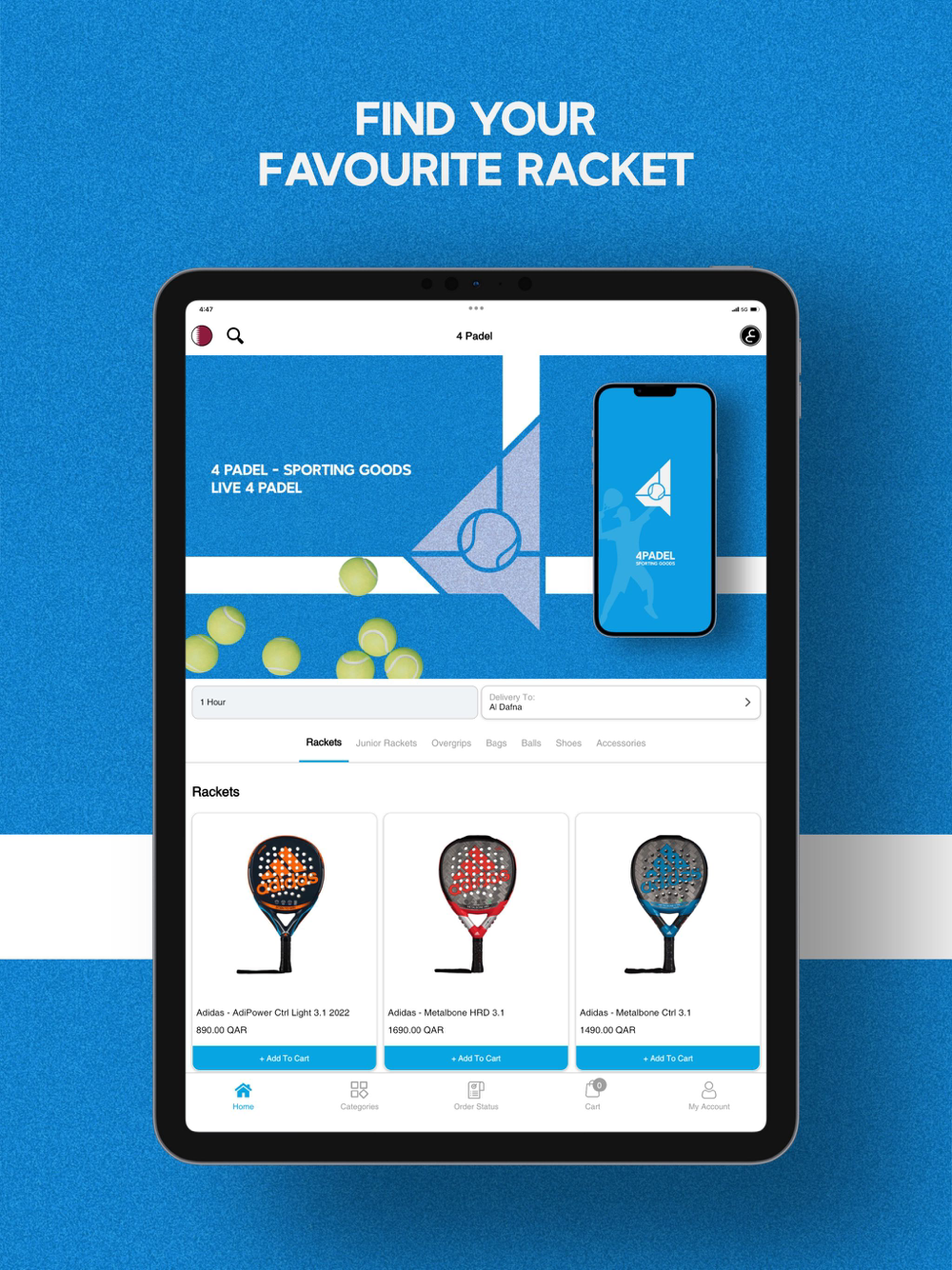 تطبيق يقدم مستلزمات رياضية لرياضة البادل. يقدم لك التطبيق مجموعة واسعة من المنتجات والعلامات التجارية من المضارب الى الاحذية وغيرها من المستلزمات.