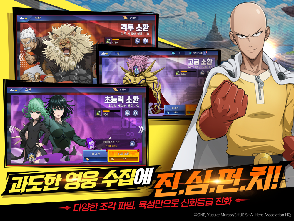 인기 애니메이션 “원펀맨” IP를 활용한 RPG게임 “원펀맨:영웅의길”은 [ONE PUNCH MAN]제작 위원회가 정식으로 허가하였으며, 집영사를 포함하여 [ONE PUNCH MAN]제작 위원회가 검수하고 있습니다.