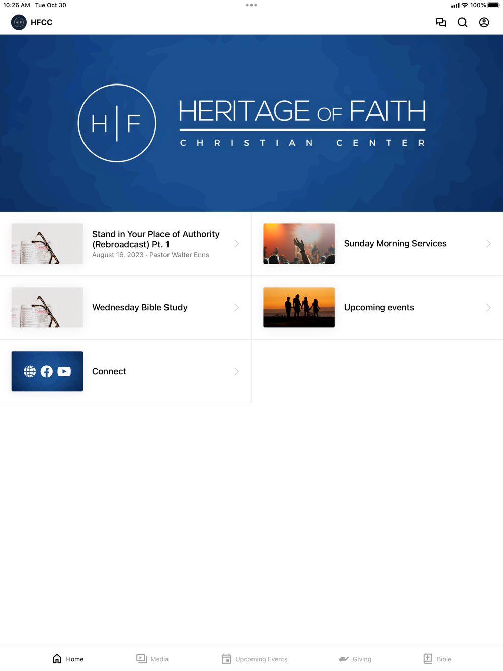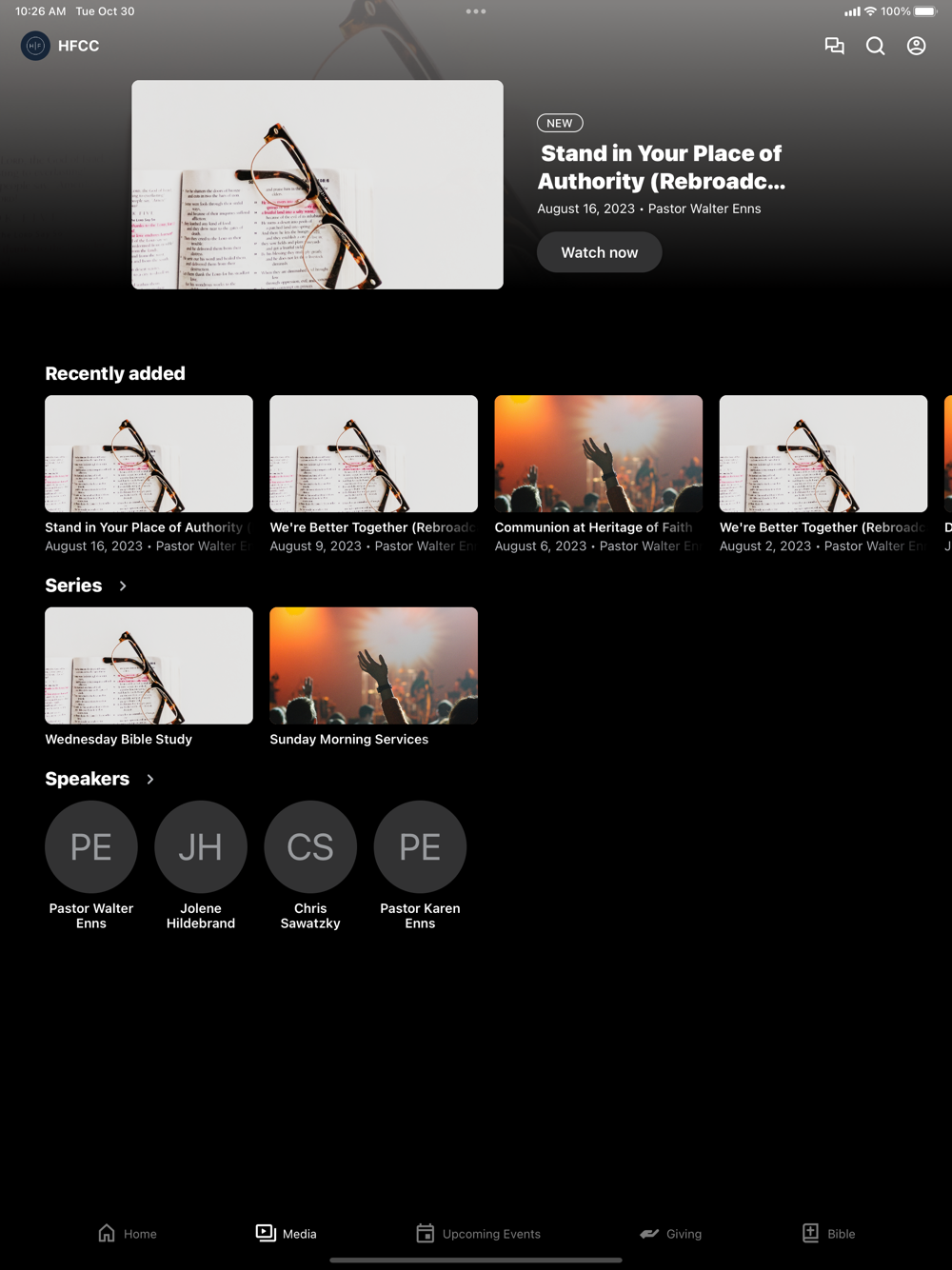 The app features weekly messages by Pastor Walter Enns and other speakers, details about HFCC events, and more.