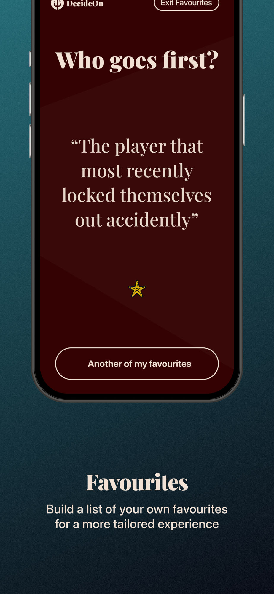 Find a new way to start every game, with DecideOn. Choose from different topic packs to spice up what deciders you're presented with.