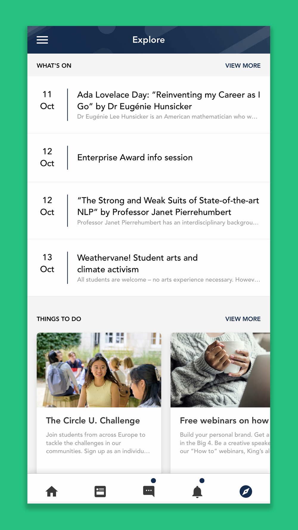 Pages in the app provide information and updates about a wide range of services and let you know about opportunities you can get involved in outside the classroom. You can follow pages that interest you to enable notifications direct to your mobile device, helping you stay up to date.