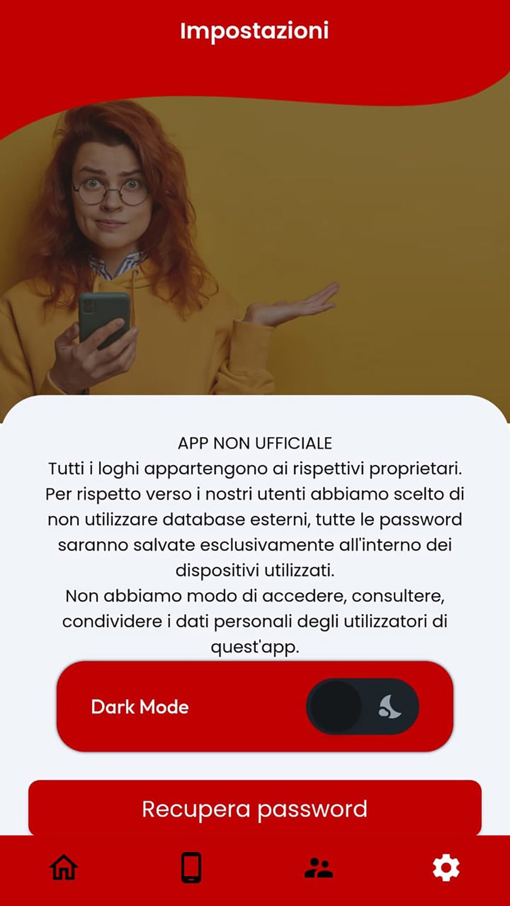 Le password saranno salvate solo sul tuo dispositivo, nessun dato sarà condiviso con database esterni, gli sviluppatori non hanno modo di accedere, vedere, modificare o condividere i tuoi dati.