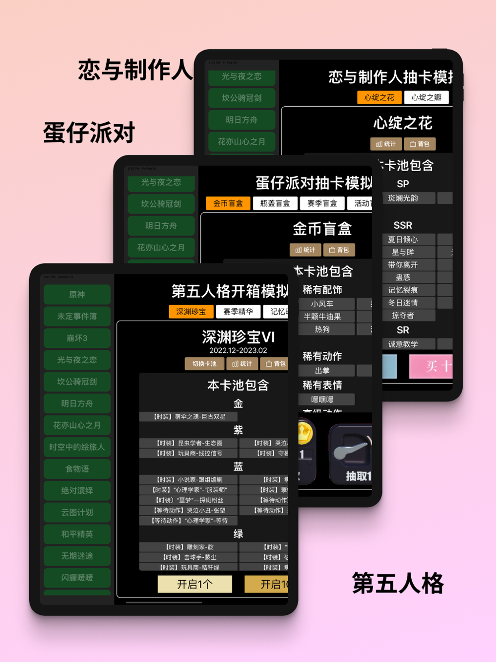 1. 辅助模拟各大游戏的抽卡,包含全面的数据统计直观反映抽出心仪的内容需要的成本。