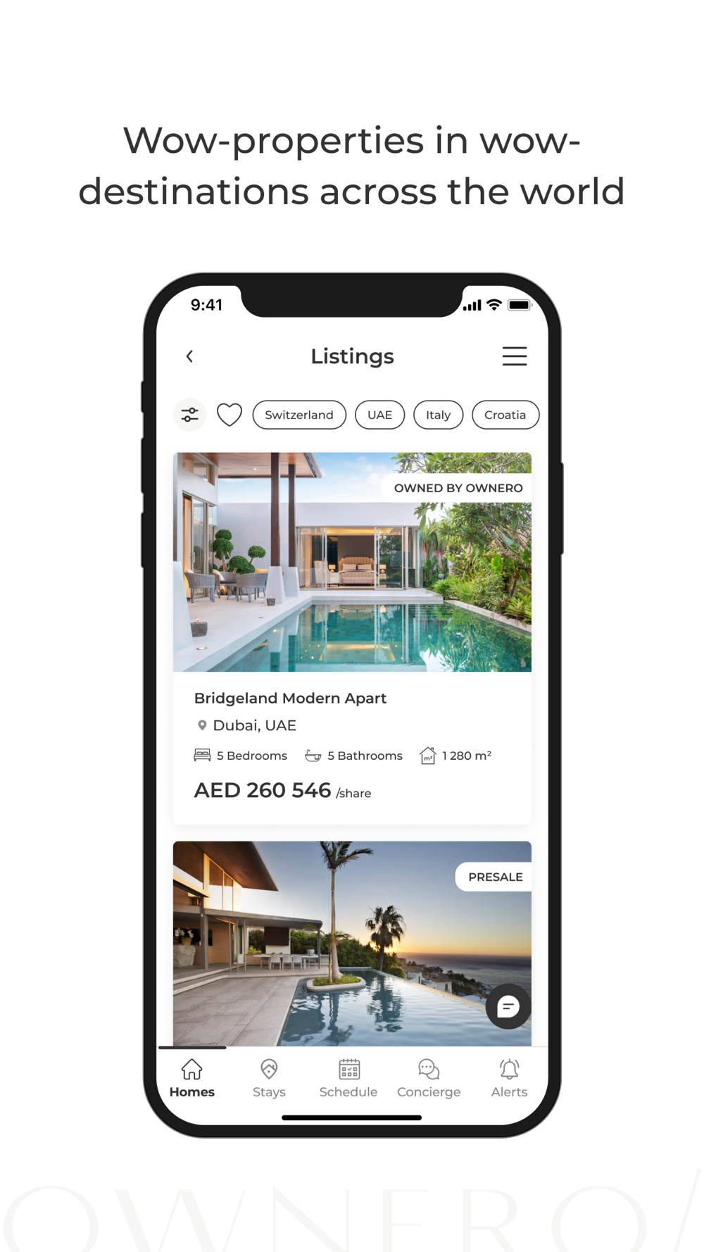 OWNERO is a real estate and hospitality service that enables people to buy second home for 1/8 of its market price and own it free of remote management hassle. Our model allows to save significantly on the purchase price and to turn all second home ownership’s «cons» into«pros». OWNERO’s proprietary platform allows B2C customers buy second homes through fully real estate holding company divided into up to 8 shares, maintain and manage their second homes, schedule their stays, distribute operating costs and taxes and easily sell shares through our partner agents and on OWNERO marketplace.