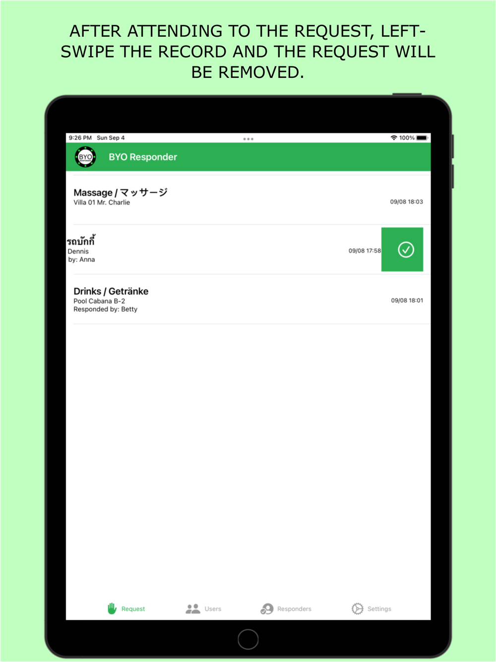 See all your requests on a single screen. Assure the customer that you are on your way by right-swiping on the record to respond to the request. And when you are done attending to the customer, swipe-left on the record to clear the request.