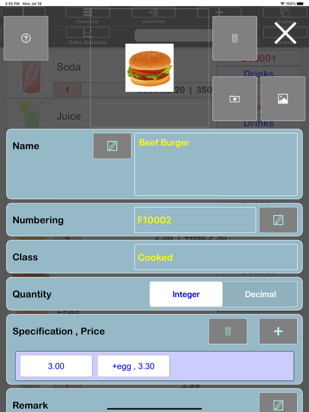 - Product information: Modifiable product name, numbering, specifications, sales notes column.
